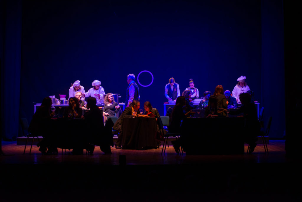 L’inizio dello spettacolo coincide con le preparazioni dello Shetland Hotel all’ora di cena: il tutto viene gestito dall’occhio vigile del maître che dà un’ultima occhiata ai tavoli, poi si dirige all’entrata: si va in scena. Da qui il pubblico si sistema sulle sue poltrone pensando di assistere all’ennesima commedia su odiosi commensali e incapaci camerieri, invece bastano pochi minuti per comprendere che coloro che recitano sanno di recitare e che l’unica differenza tra attori e spettatori dipende dal punto di vista.