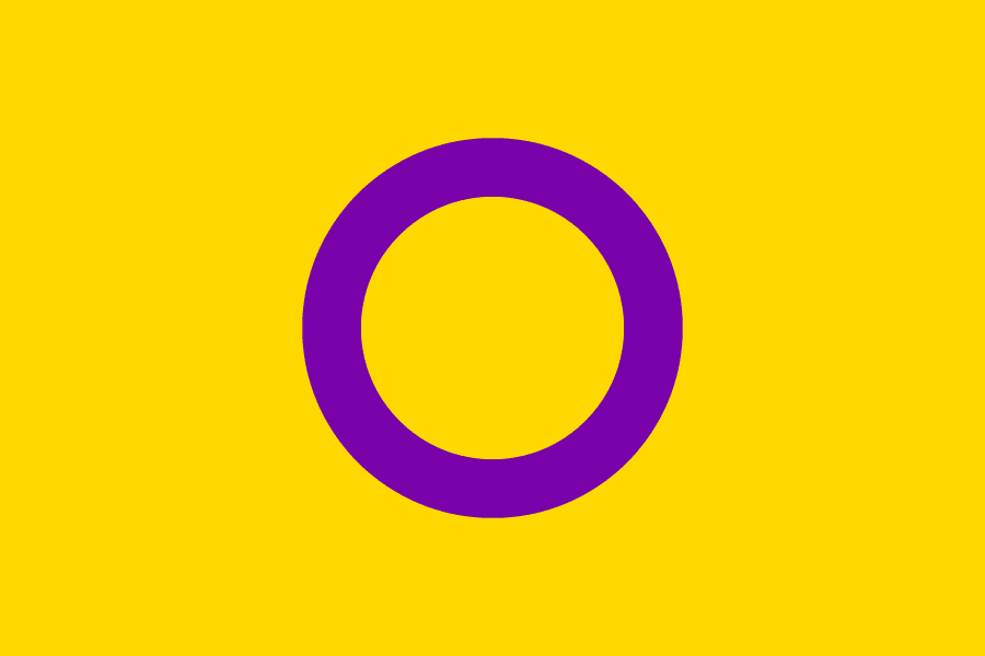 La bandiera della comunità intersex. Su uno sfondo giallo, al centro troviamo una circonferenza viola.