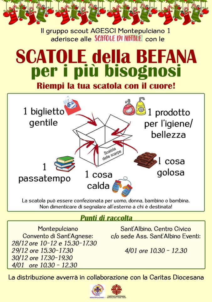 “Scatole delle Befana” è un progetto di solidarietà organizzato dal gruppo Scout Montepulciano 1 e dalla Caritas Diocesana, con l’obiettivo di donare un momento di gioia ai più indigenti. All’iniziativa, già promossa da diverse associazioni in tutta Italia, può partecipare chiunque voglia donare una serie di piccoli oggetti e del cibo ai più bisognosi.