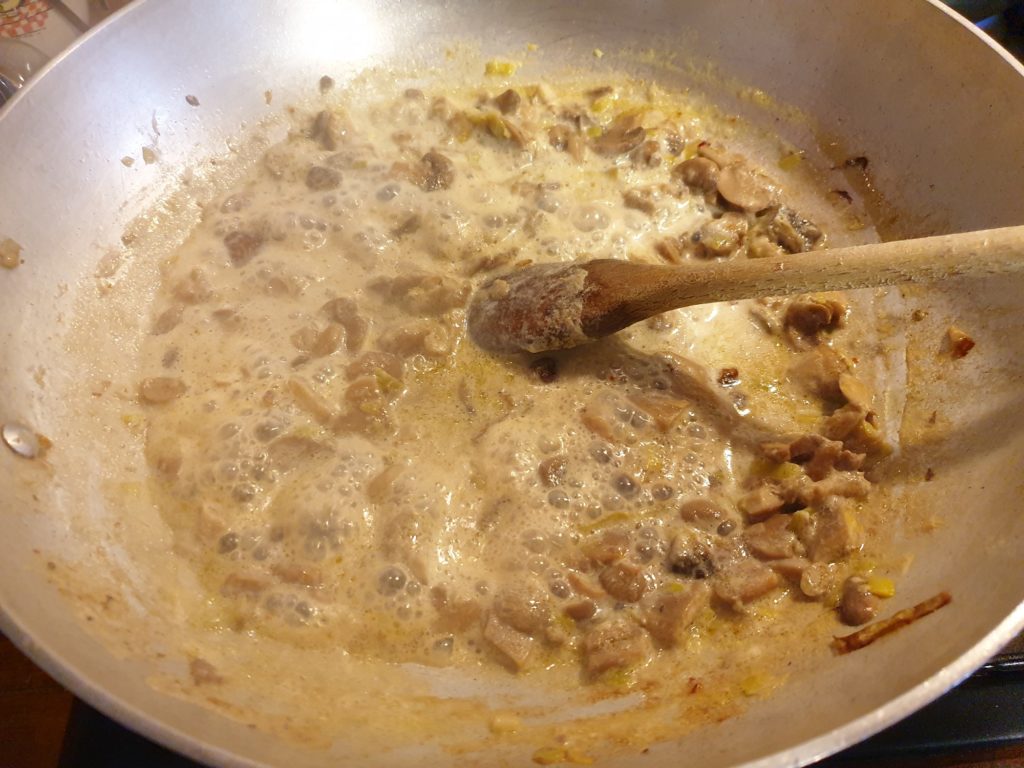 In una buona padella soffriggere in olio evo un trito di Aglione a bassa temperatura, unire i funghi ancora surgelati e portare a cottura. Versare il latte e far ritirare il tutto aggiustando di sale e di spezie desiderate (pepe/peperoncino).