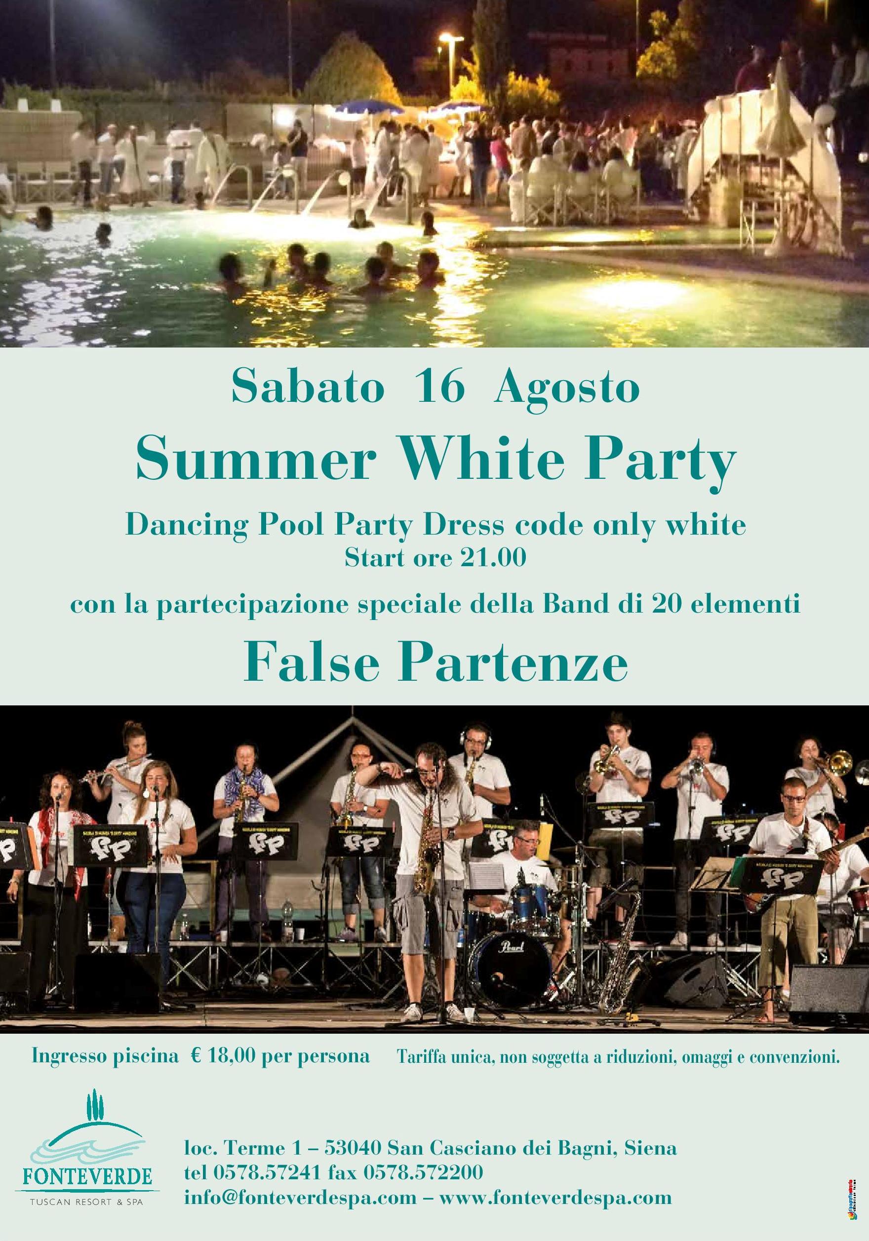 L’evento più glam dell’estate si prepara a tornare a San Casciano dei Bagni: anche quest’anno, infatti, Fonteverde Tuscan Resort & Spa ospiterà il “Summer White Party” il prossimo 16 agosto. Una festa danzante a bordo piscina dove il dress code è rigorosamente bianco. A partire dalle ore 21.00, le danze si aprono al ritmo della musica della band di 20 elementi, False Partenze. E tra un ballo e l’altro, i partecipanti potranno godersi un tuffo in piscina e rilassarsi all’open bar.