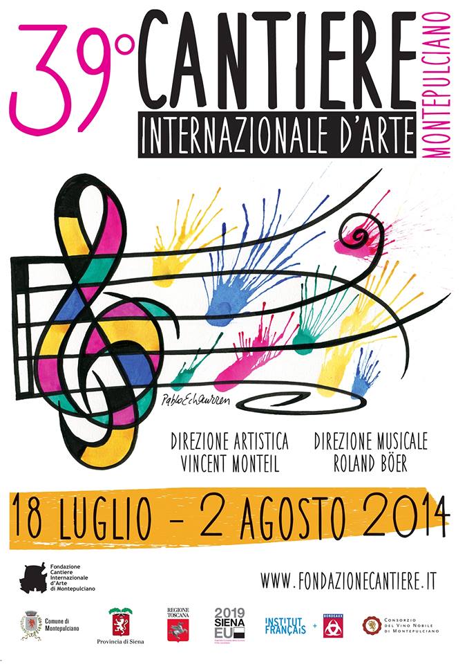 Più di 50 eventi a Montepulciano e in tutta la Valdichiana, dal 18 luglio al 2 agosto 2014. Il 39° Cantiere Internazionale d’Arte è stato presentato a Roma, rivelando un cartellone ricco di iniziative, ispirato al tema dell’aria; il manifesto ufficiale della festival estivo è stato firmato dall’artista Pablo Echaurren. Inoltre, il concerto di chiusura della 39esima edizione del Cantiere Internazionale d’Arte raddoppia: dopo l’esecuzione di Montepulciano, verrà concluso a Siena, in Piazza Duomo, per sostenere la candidatura Capitale Europea della Cultura.