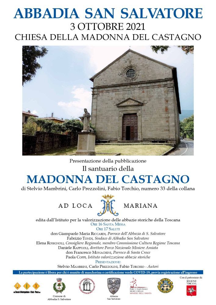 Nel pomeriggio di domenica 3 ottobre, presso la Chiesa della Madonna del Castagno di Abbadia San Salvatore, è in programma la presentazione di una plaquette dedicata al Santuario della Madonna del Castagno. La pubblicazione, edita dall’Istituto per la Valorizzazione delle Abbazie Storiche della Toscana, è la numero 33 della collana Ad Loca Mariana ed è stata curata da Stelvio Mambrini, Carlo Prezzolini e Fabio Torchio.