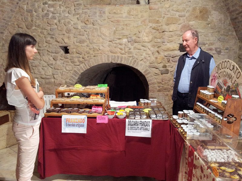 Nel nostro percorso enogastronomico all’interno della mostra “Arti e Sapori” ci siamo poi imbattuti nell’esposizione della Dolciaria Franzago, con il suo assortimento di cioccolatini, tavolette e dolci di ogni genere, accomunati dall’utilizzo di cioccolata artigianale di qualità. Un’impresa familiare attiva dal 1980 con la realizzazione di uova di pasqua e che si è poi specializzata nella creazione di prodotti innovativi, come i cioccolatini alla birra. O il particolarissimo cioccolato al sale, che va assaporato senza masticare e che è perfetto in abbinamento con il vino. La famiglia Moscatelli, che ha passato al figlio la tradizione della realizzazione del cioccolato, è spesso ospite a Montepulciano con la manifestazione “Toscana Gustando” organizzata dal centro commerciale naturale, ed è particolarmente attiva nel circuito slow food, distribuendo le sue produzioni a enoteche per abbinamenti particolari e innovativi.