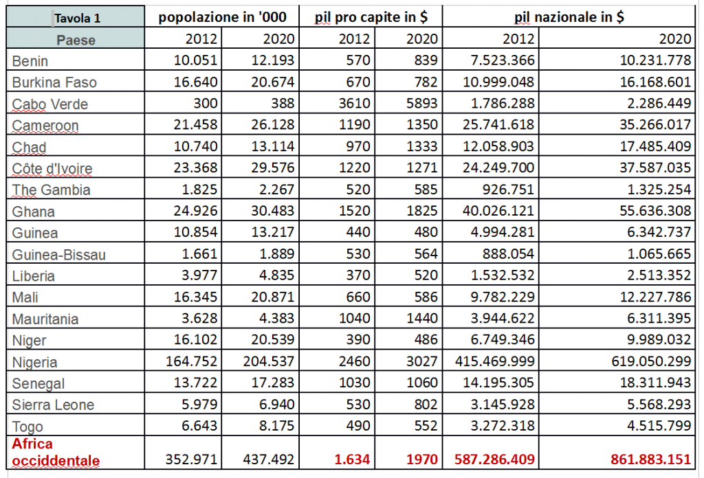 Negli anni più recenti è cresciuto il flusso migratorio verso l’Italia dai paesi dell’Africa Occidentale (Nigeria, Senegal, Ghana, Costa d’Avorio, Camerun, ecc). Nella tavola che segue sono elencati i 18 Paesi dell’Africa Occidentale, trend di popolazione e PIL dal 2012 al 2020, secondo le stime del Fondo Monetario Internazionale: