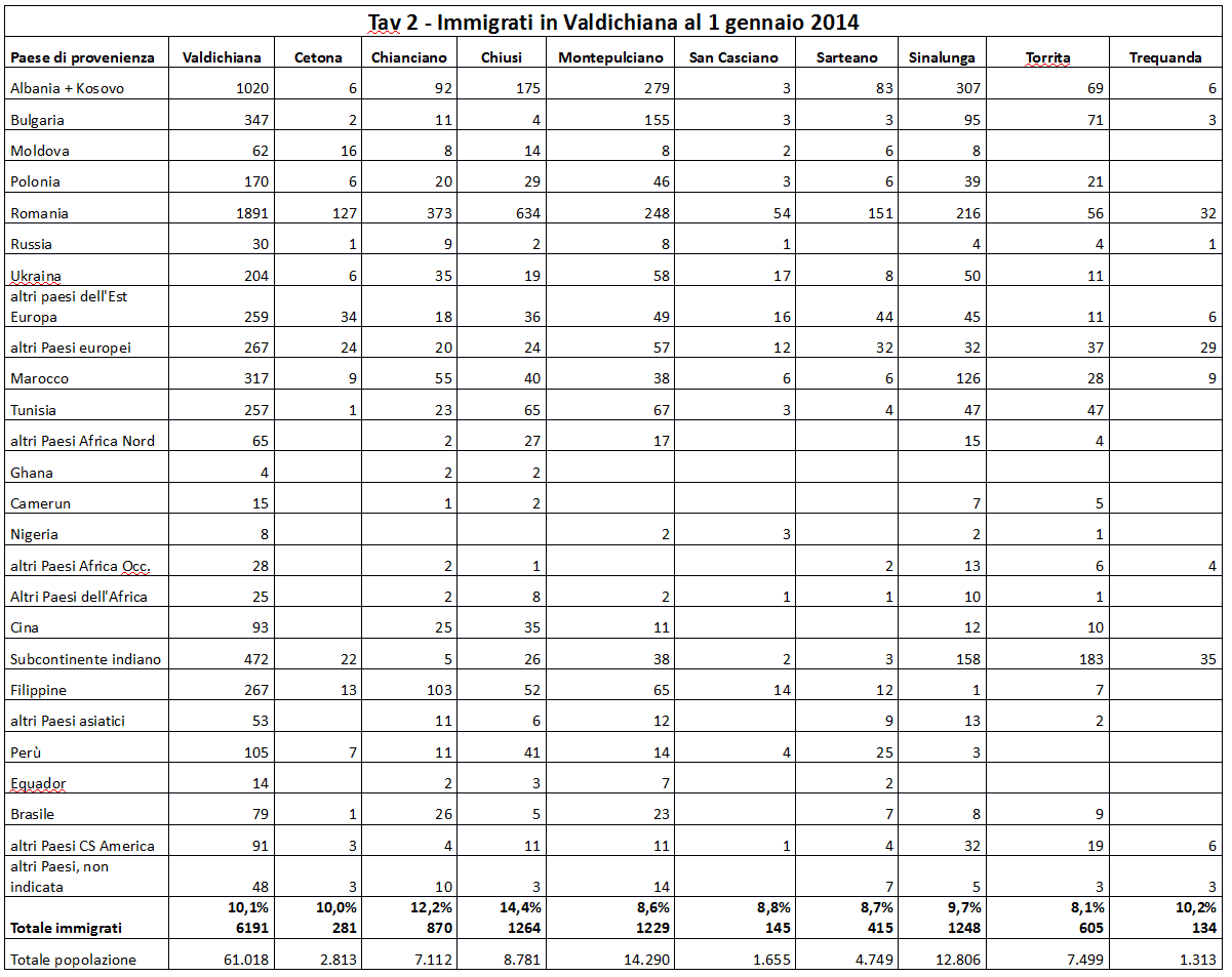 A livello nazionale la popolazione immigrata è pari al 8,2%. In totale si tratta di 4.980.000 stranieri, di cui 53% dai Paesi europei, 22% dall’Africa (15% dal Nord Africa e 6% dall’Africa Occidentale, 1% dal resto dell’Africa), 17% dai Paesi asiatici e 8% dal Centro sud America. Nella tavola che segue sono rappresentati i Paesi di provenienza dell’immigrazione nei 9 comuni della Valdichiana senese:
