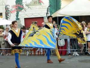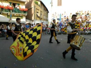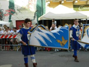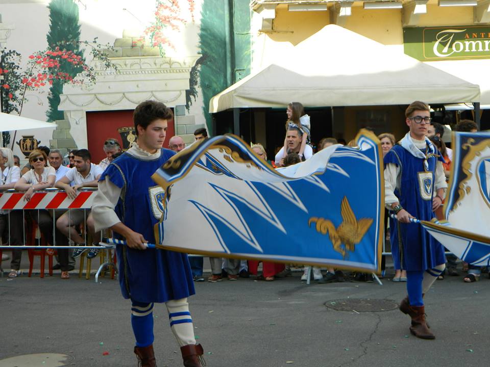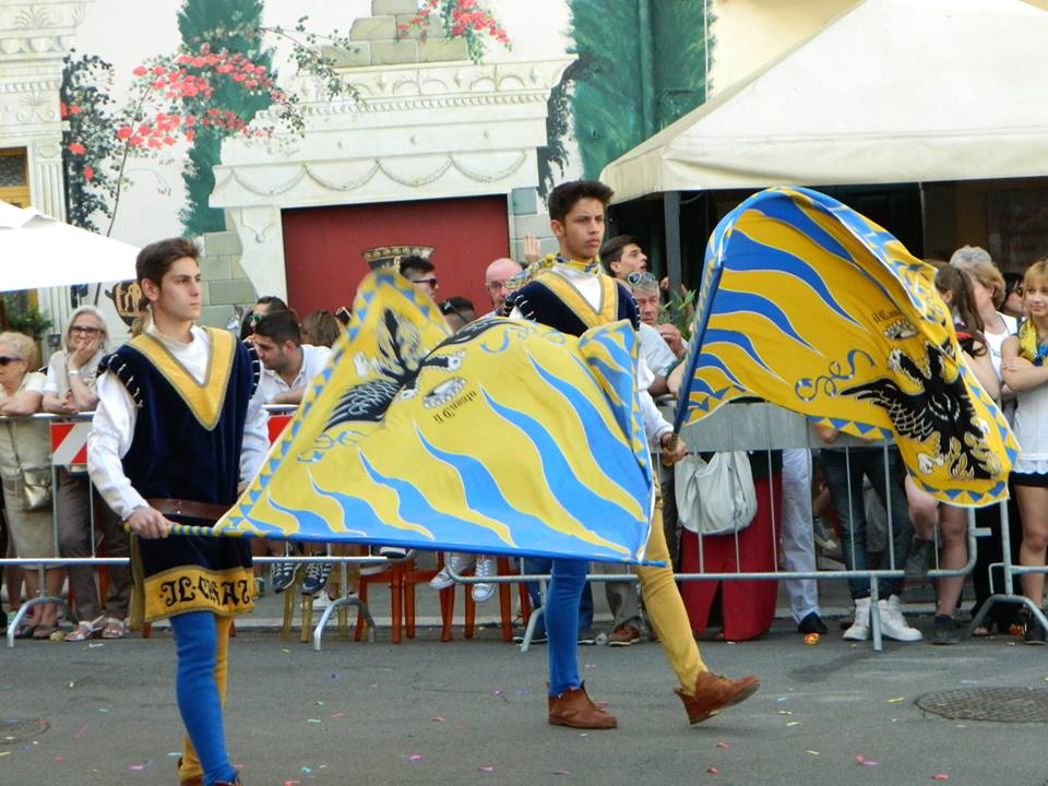 La contrada campione in carica. La dimostrazione palese che la Nobiltà è saper attendere, che la Nobiltà è saper aspettare il sole per il quale nessuna notte è mai così lunga da impedire l’alba. E come il sole presente e vivo il grande popolo Post Nobiliare di Bettolle, dall’estremità a sud del paese, a circondare il tasso di nobiltà e di eleganza della Villa Cassatum Bettollarum concessa con privilegio dall’Imperatore Enrico II all’Abate di Farneta nel 1014 e successivamente ristrutturata dagli eredi del Conte Walfredo, che l’aveva ricevuta dall’Imperatore Ottone IV nel 1209. La cassazione della gioia. Giallo come il colore del Sole e della ricchezza spirituale primariamente che materiale, e blu come il colore del suo sangue; entra in piazza la Nobile contrada del Casato!