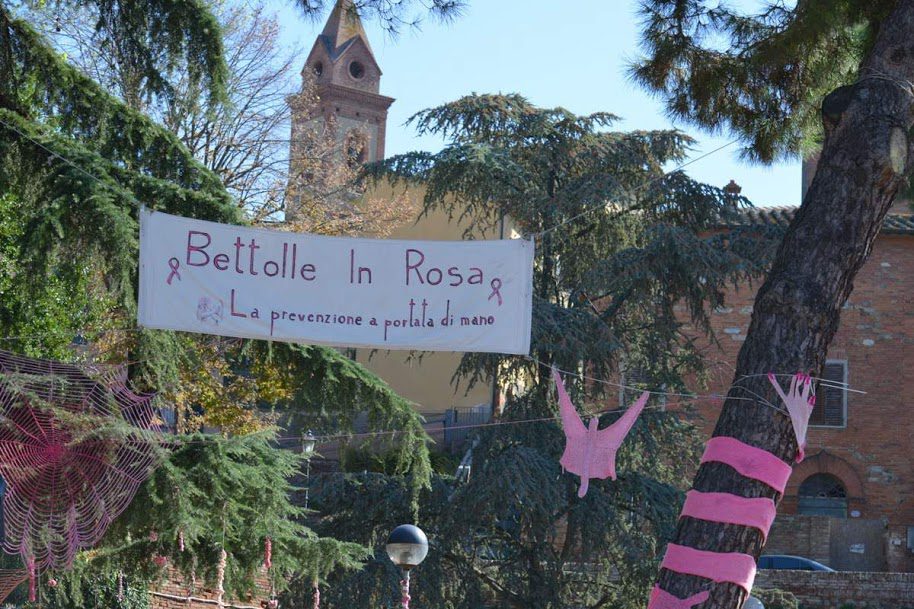 Se si attraversa il piccolo centro urbano di Bettolle durante il mese di ottobre non può non saltare all’occhio la persistenza del colore rosa, nei viali, nelle piazze e nei giardini. Drappeggi enormi composti da quadrati di lana, lunghi anche decine di metri, appesi ai cartelli stradali, intorno agli alberi, distesi lungo ringhiere, sui reticoli e sule paratie stradali. Sono lane, stoffe e nastri, rigorosamente rosa, spesso annodati assieme, a richiamare il simbolo che ormai da anni simboleggia la lotta contro il tumore al seno. È l’urban knitting (conosciuto anche come pratica di Yarn Bombing) che dal 2016 il comitato Bettolle in Rosa porta avanti per sensibilizzare la popolazione alla prevenzione e alla cura di sé.