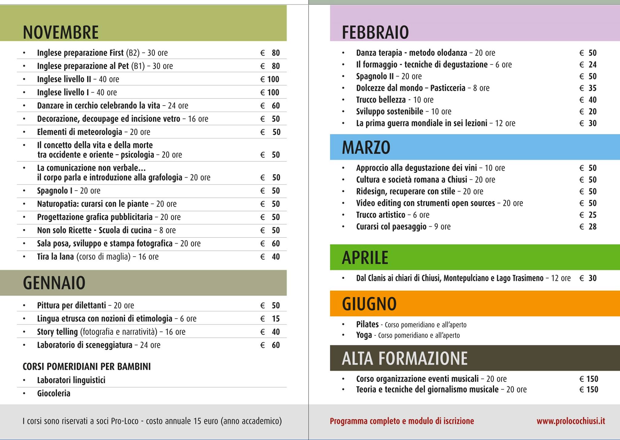 Oltre ai corsi di novembre fino a giugno 2015 l’Unipop chiusina spazierà in tanti e diversificati campi della conoscenza come ad esempio: pittura, lingua etrusca, giocoleria, storia, degustazione, make-up e fitness.
