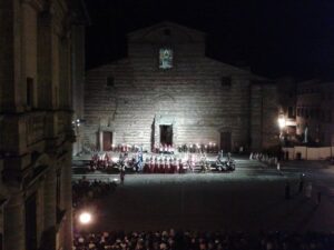 Il particolare intento di Wanda Moretti, coreografa della compagnia, è proprio quella di adibire gli spettacoli al paesaggio ove questi vengono rappresentati, e non viceversa. Un modo per osannare la forza e la potenza dei luoghi come spazi artistici potenziali e far scaturire da questi tutto l’immaginario e le evocazioni possibili. Per questo – più o meno come avviene ad esempio per la via di Gracciano illuminata soltanto dai cerini sulle padellette ai bordi del vicolo, durante il corteo – nessuno, nemmeno chi ci lavora dentro, ha mai visto la facciata del Palazzo Comunale come l’ha vista durante l’esibizione delle “danzatrici verticali”, che hanno eseguito la loro performance sulla sua facciata.