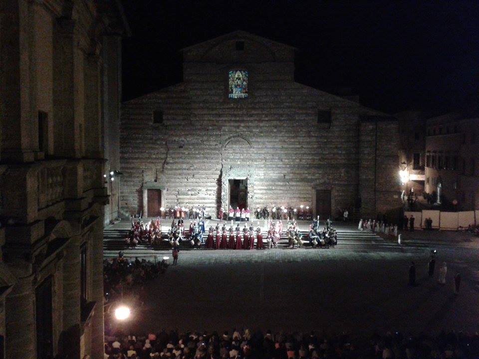 In seguito all’accensione dei ceri, il gruppo sbandieratori e tamburini di Montepulciano scorre sul piano centrale di piazza grande. I tamburini si inquadrano in precise figure geometriche, seguendo passi ritmici decisamente energici. Le bandiere sono la bellezza della rievocazione. Soprattutto quando la manifestazione che le coinvolge fa sì che esse si strutturino entro un gruppo organizzato di sbandieratori, tamburini e musici. Inutile dire come la meravigliosa cartolina di Piazza Grande e le sue architetture, amplificanti il suono dei 17 tamburi, tra imperiali e semi-imperiali, la destrezza e l’eleganza di 24 bandiere che alternano i loro giochi singoli e collettivi, abbia affascinato e avvinto l’attenzione della marea di avventori che si sono riversati nelle strade del borgo e nelle tribune della piazza.