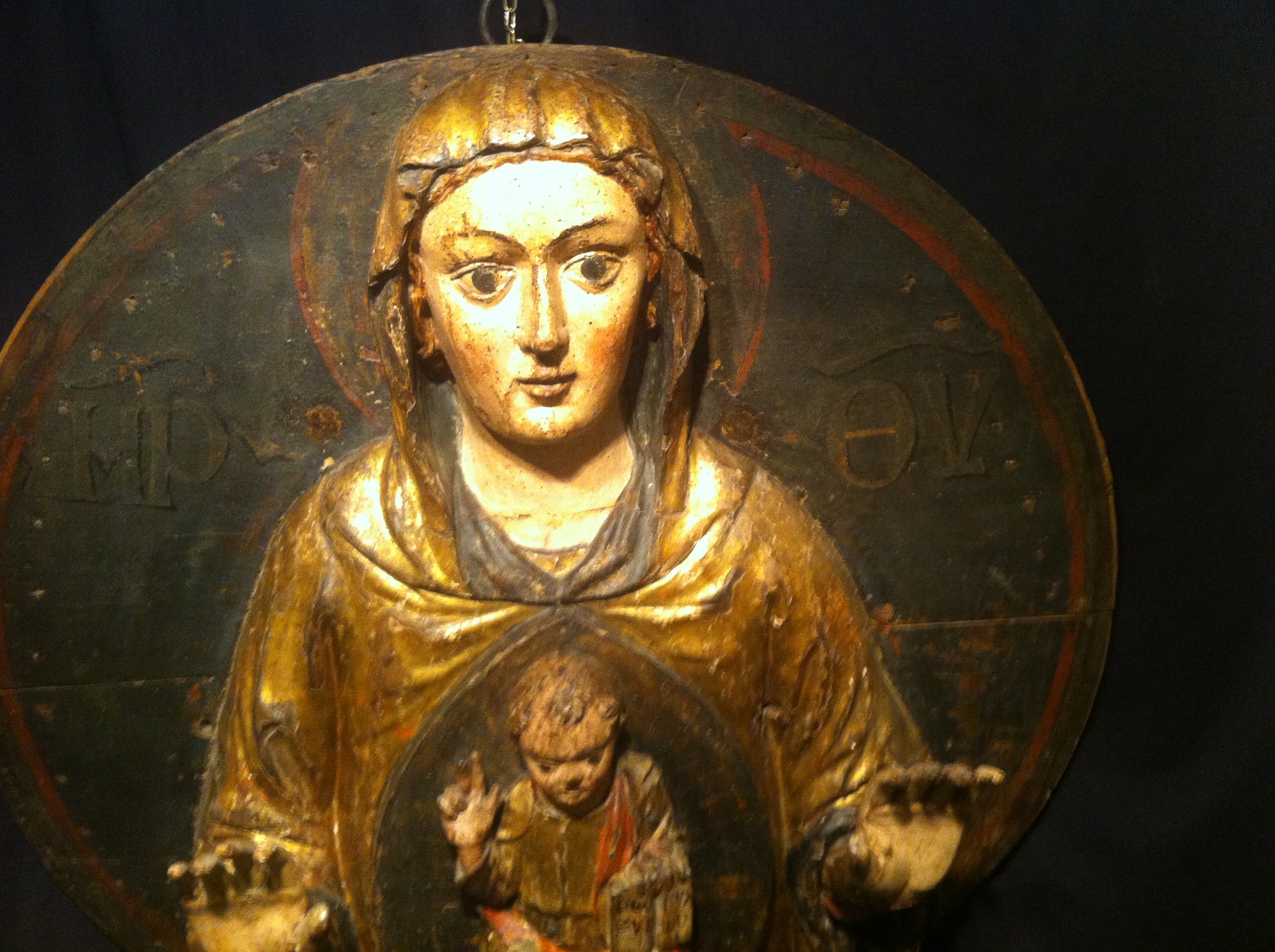tondo ligneo 2Oltre a questo si può restare colpiti da un’opera unica sia per dimensioni che per qualità e rarità, risalente alla metà del 1200 ed è un tondo ligneo di eccezionale fattura e conservazione che rappresenta una Madonna con Bambino.