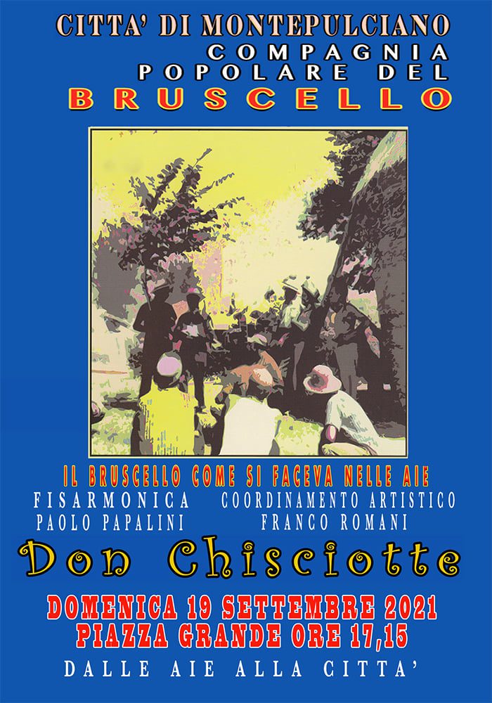 Domenica 19 settembre a Montepulciano torna il Bruscellino, uno spettacolo di strada realizzato dalla Compagnia Popolare del Bruscello che allieta visitatori e passanti in una versione più simile a quella della tradizione contadina, come si faceva nelle aie delle campagne. L’appuntamento con “Don Chisciotte” è per le ore 17:15 in Piazza Grande.