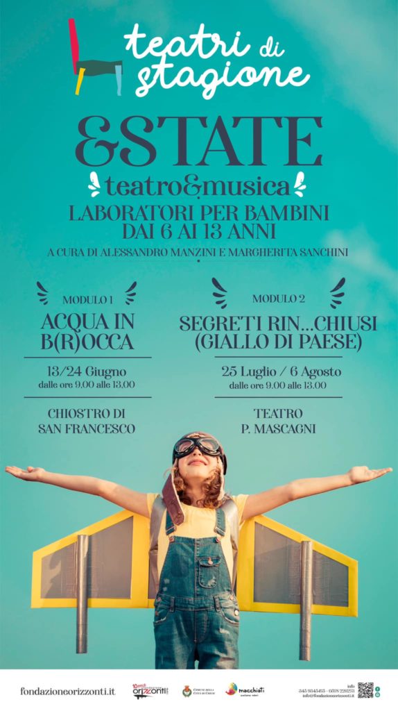 Potranno partecipare ai Teatri di Stagione-ESTATE tutti coloro che hanno tra i 6 e i 13 anni divisi in due moduli diversificati così da dare la possibilità a tutti di iscriversi due volte. Il primo modulo “ACQUA IN B(R)OCCA”, che si terrà presso il Chiostro di S. Francesco con inizio il 13 di giugno e si concluderà il 24 dello stesso mese. Il secondo modulo “SEGRETI RIN…CHIUSI- Giallo di paese”, che si terrà dentro il Teatro Mascagni e inizierà il 25 luglio e con termine il 6 agosto. I corsi, indipendentemente dal modulo, si svolgeranno la mattina, dalle ore 9:00 alle ore 13:00.