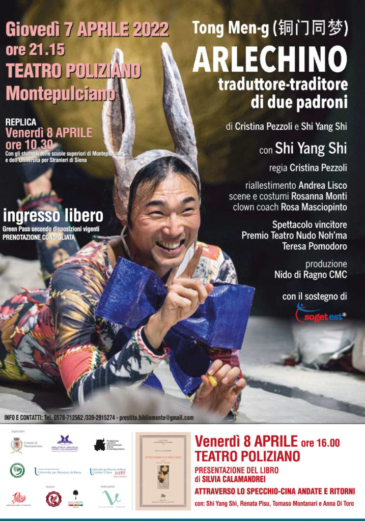 Nei due giorni di iniziative tornerà a Montepulciano Shi Yang Shi, artista che la città ha già avuto modo di conoscere nel 2018. Giovedì 7 aprile alle 21:15, al Teatro Poliziano, sarà presentato lo spettacolo a ingresso libero “Arlechino – Traduttore-traditore di due padroni”, di Cristina Pezzoli e Shi Yang Shi; con Shi Yang Shi; regia di Cristina Pezzoli; riallestimento di Andrea Lisco, a cura della Nidodiragno CMC Produzioni. In scena un monologo che racconta la storia di un ragazzo cinese di seconda generazione con l’anima divisa tra due lingue e due culture e che prova, attraverso un incontro-scontro interiore, a combattere gli stereotipi e i pregiudizi reciproci. Lo spettacolo sarà replicato venerdì 8 aprile, alle 10:30 per gli studenti di alcune classi delle scuole superiori di Montepulciano e dell’Università per Stranieri di Siena.