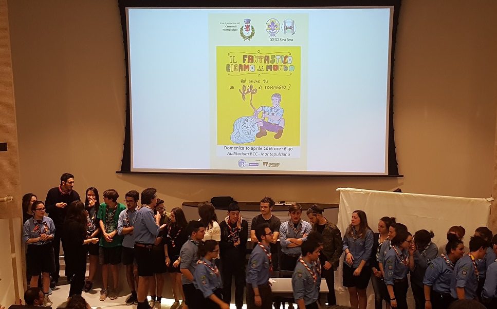 Che cosa significa far parte degli scout nel 2016, in Valdichiana? Questa è la prima domanda che mi è venuta in mende quando la nostra redazione è stata invitata dal gruppo scout Agesci di Montepulciano ad assistere all’‘evento che si è svolto presso l’Auditorium della BCC Montepulciano. Gli scout della provincia senese hanno preparato delle rappresentazioni teatrali per sensibilizzare gli spettatori sul tema del coraggio, chiamata “Il fantastico ricamo del mondo”, sulle problematiche dei giovani tra i 17 e i 21 anni.