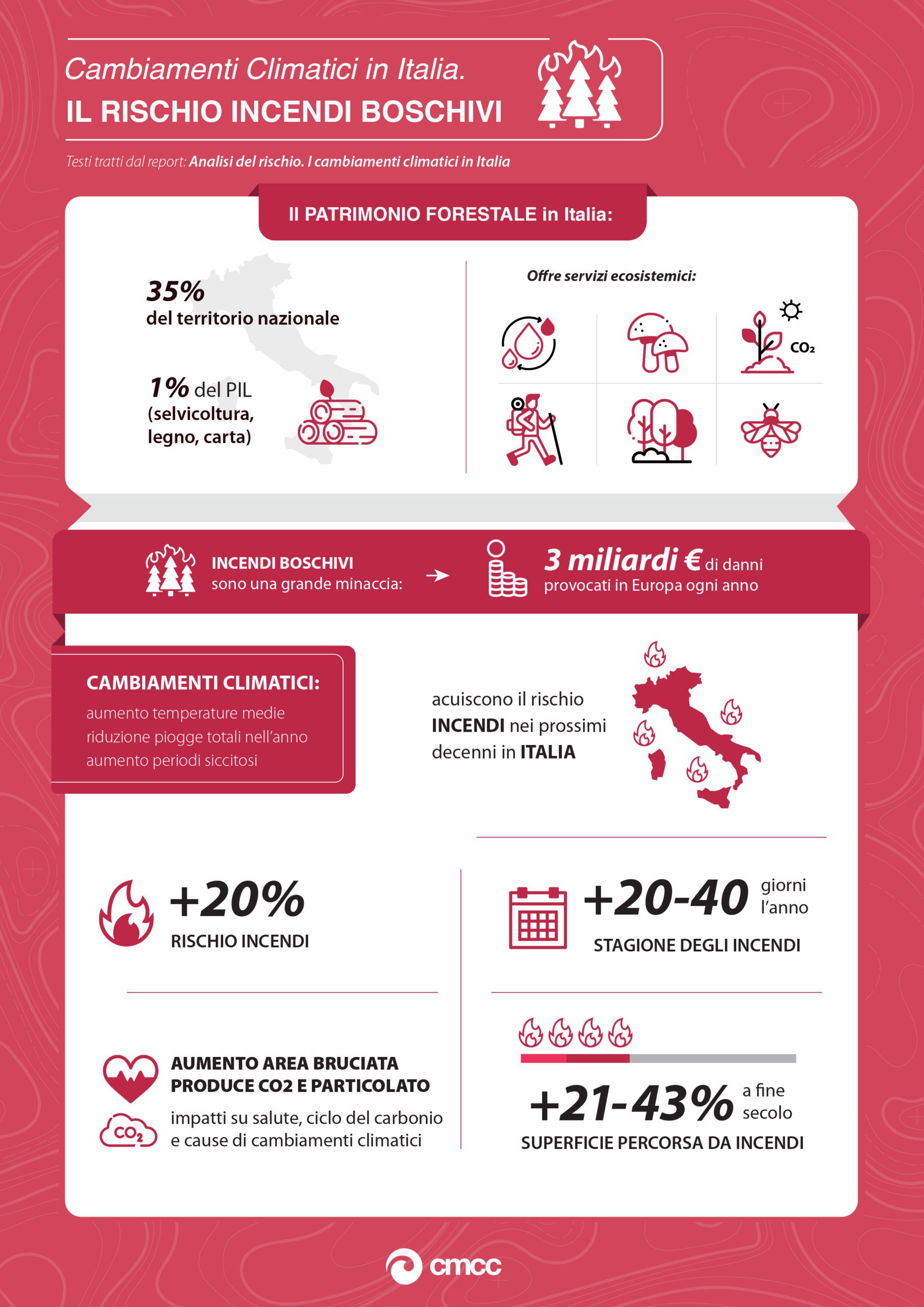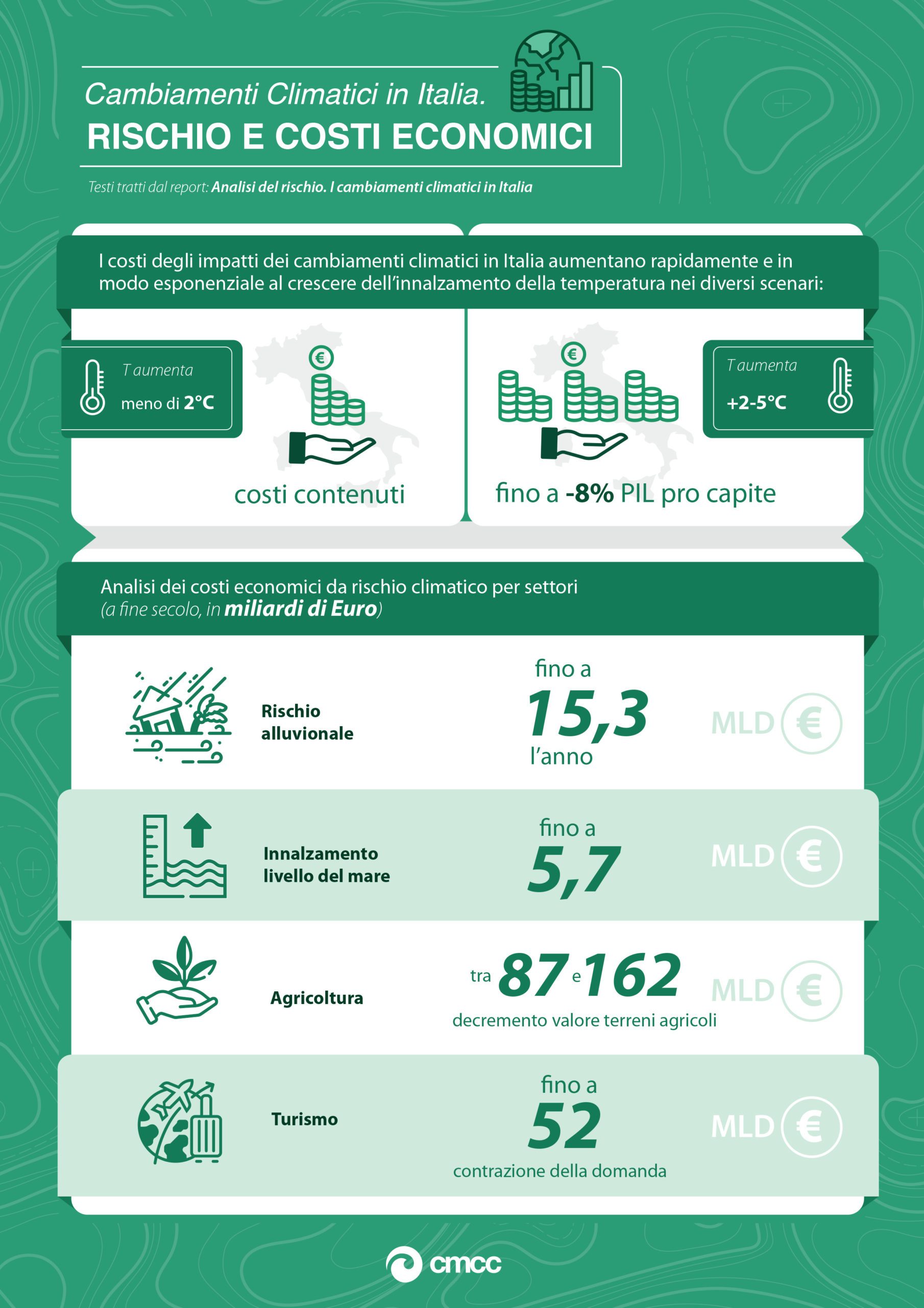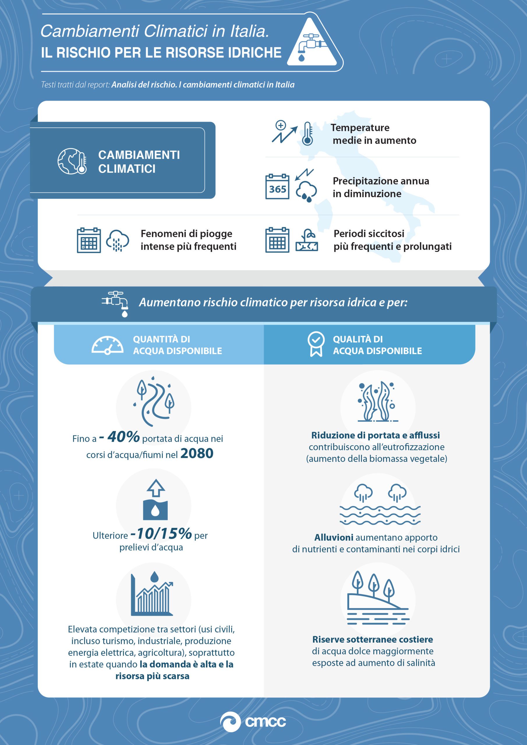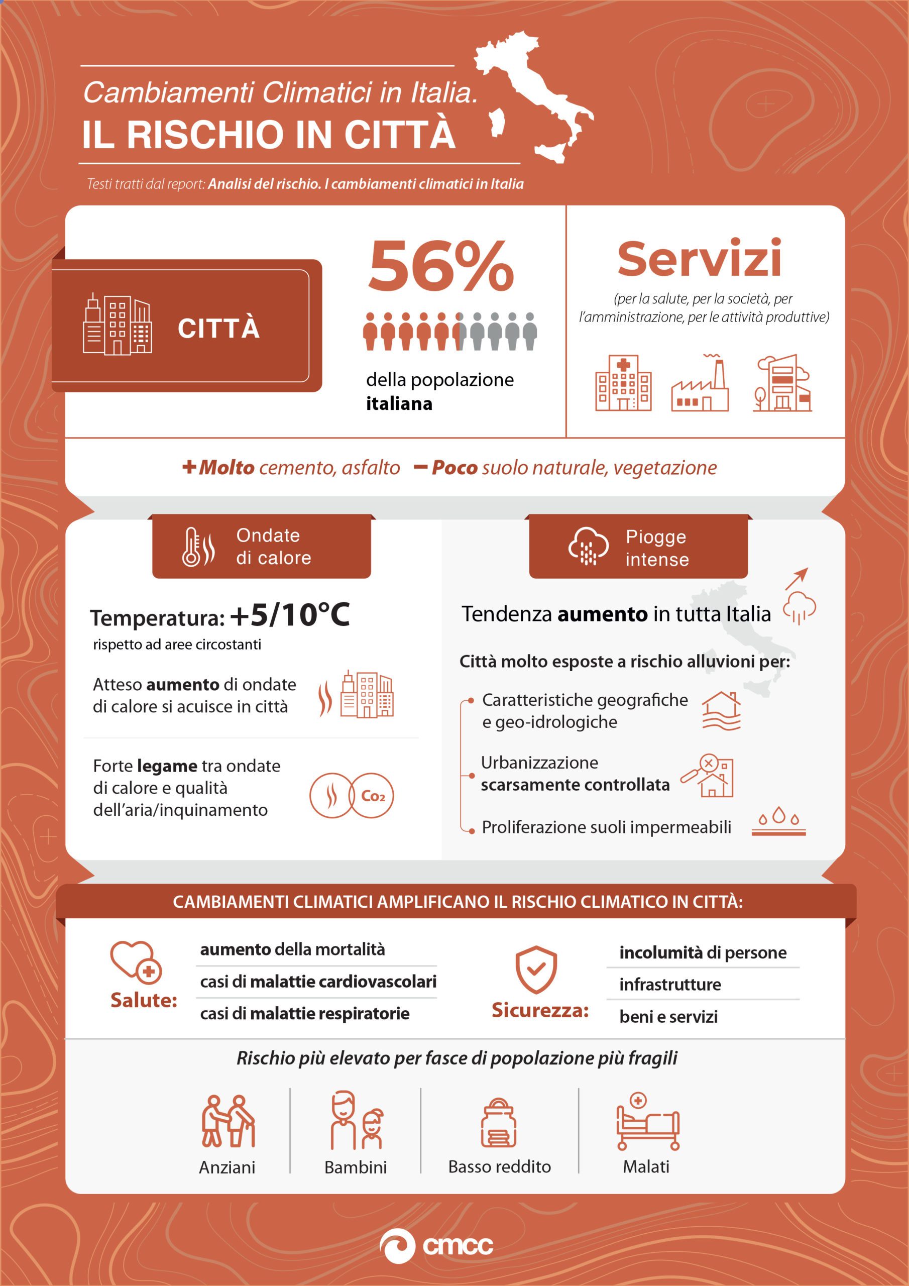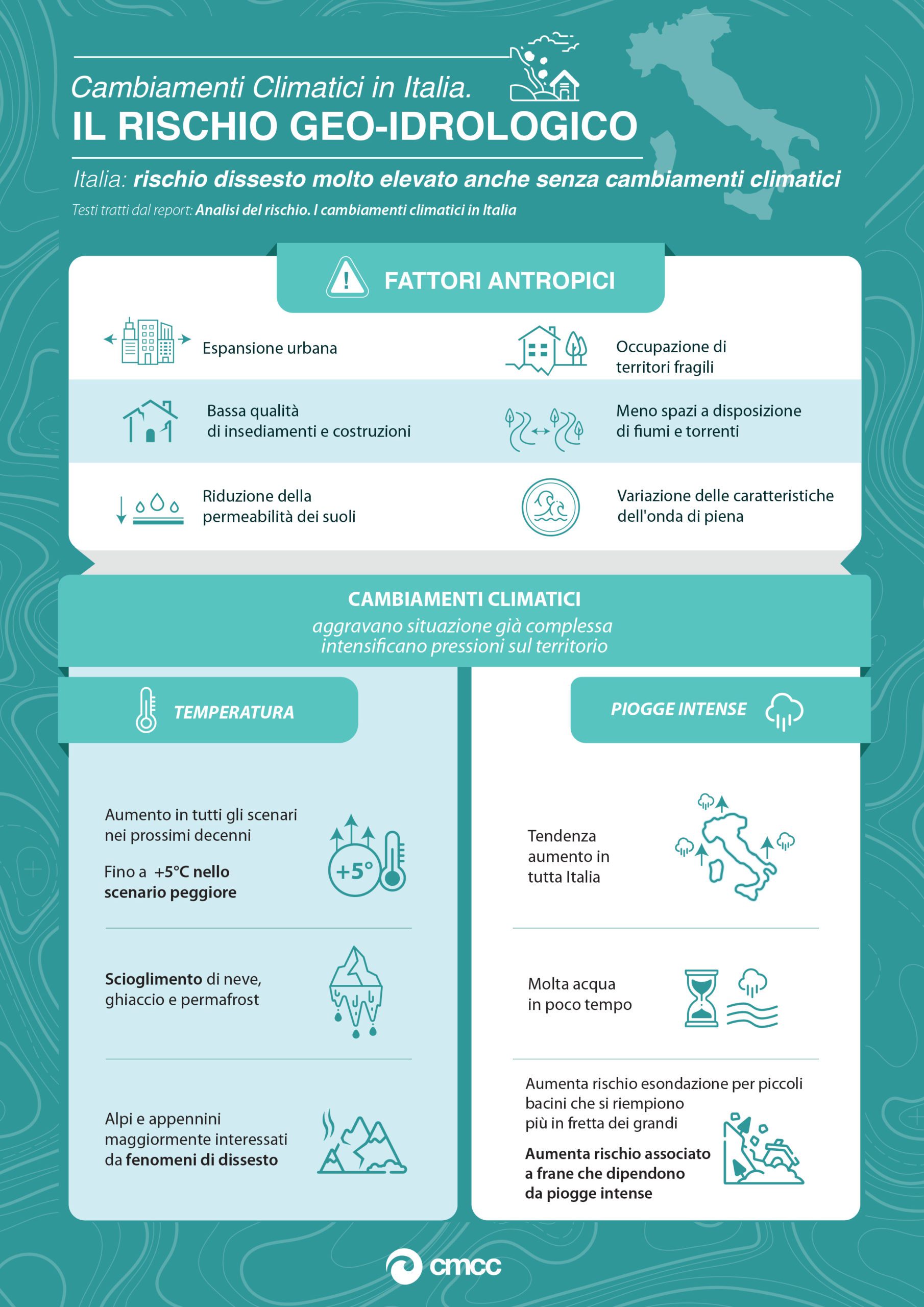 Solo pochi giorni fa, la Fondazione Centro Euro-Mediterraneo sui Cambiamenti Climatici di Lecce ha pubblicato un corposo report che evidenzia in maniera esaustiva quali sono gli scenari di cambiamento climatico attesi per l’Italia e quali sono i rischi che tali cambiamenti potrebbero determinare.