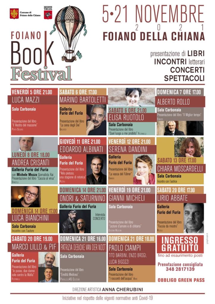 Dopo il successo di critica e di pubblico della prima edizione 2019 (comprese le due code estive) e dopo l’annullamento dell’edizione 2020 causa Covid, torna finalmente il Foiano Book Festival e lo fa in grande stile. La kermesse letteraria che si svolge a Foiano della Chiana, in questa seconda edizione cresce e si rinnova per riproporre in forma ulteriormente arricchita la sfida per cui era nata: creare un nuovo evento stabile in Valdichiana e in Provincia di Arezzo che fosse alla portata di tutti, ma al tempo stesso di alto livello culturale.