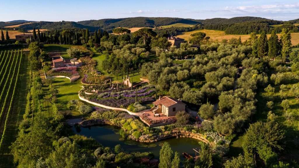 Appena essersi lasciati alle spalle il bivio che conduce al Tempio di San Biagio e aver percorso poche centinaia di metri verso Monticchiello sulla Via di San Bartolomeo, si individua, oltre un imponente cancello, Villa Trecci. Il giardino che la circonda offre ai suoi visitatori l’esperienza sinestetica di camminare avvolti dai profumi e dai suoni provenienti dalle erbe e dagli arbusti, divenuti nidi di molteplici varietà di insetti, e dai colori dei fiori e delle colline che si dispiegano tutt’intorno.