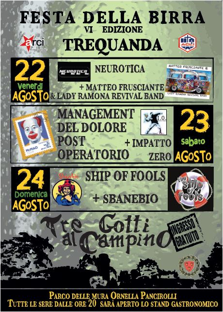 Anche quest’anno, dal 22 al 24 agosto, torna a Trequanda Tre Gotti al Campino. Giunta alla VI edizione Tre Gotti al Campino ha in serbo numerose novità per il suo pubblico; molteplici artisti saliranno il palco di 3GAC, dalle band emergenti locali a band già affermate nel campo della musica indipendente italiana. Si comincia venerdì 22 agosto con Neurotica-Alternative Rock di Rapolano Terme (SI) già protagonisti di palchi di tutta la regione e non solo. Nel 2000, con l’ingresso di Andrea Scelfo, la band è mutata completamente, arrivando a quella miscela esplosiva di alternative rock / post grunge che lo caratterizza. Inoltre, nel 2005 hanno pubblicato il loro primo album autoprodotto.