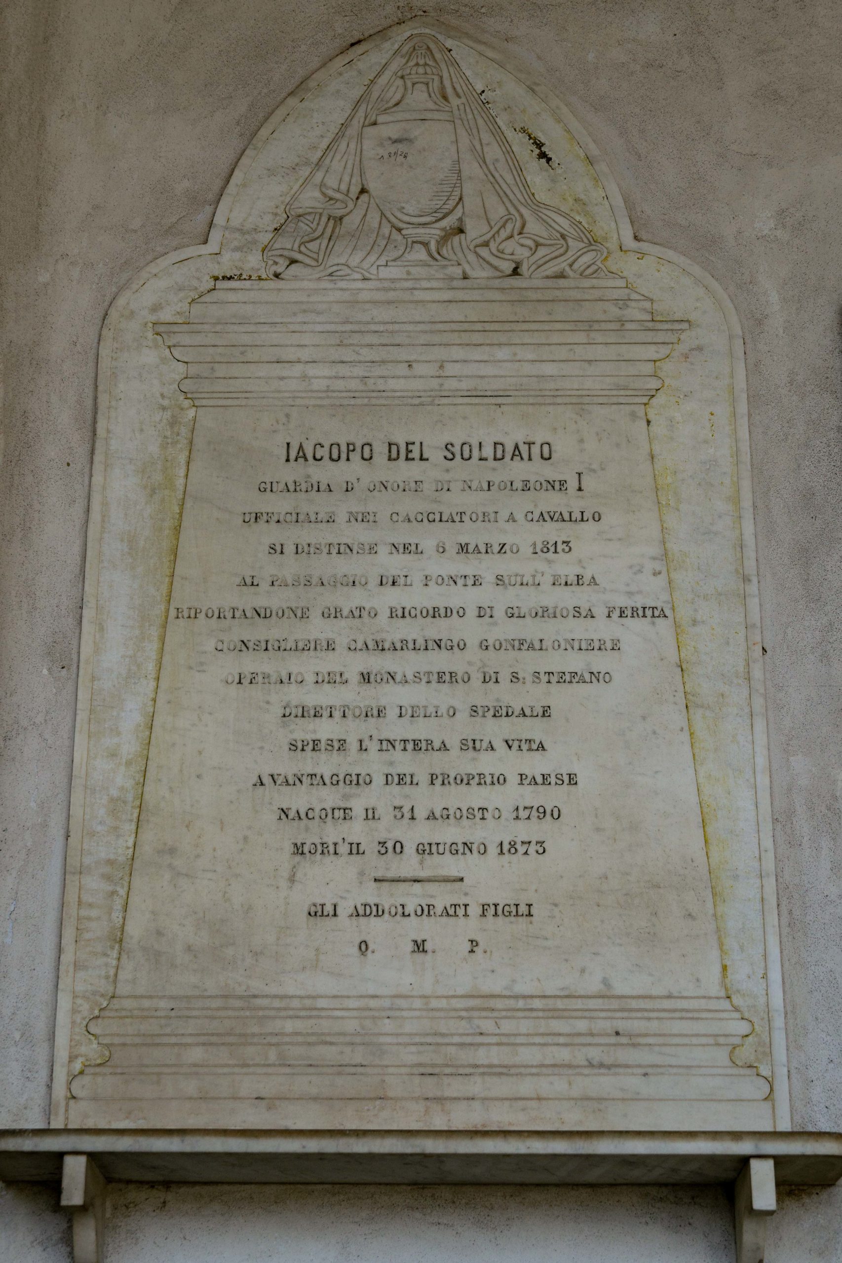 Del Soldato, come recita la scritta commemorativa, si distinse nella battaglia sul fiume Elba. Un tentativo di difesa dei confini dopo il disastroso fallimento della campagna di Russia del 1812. Fu inoltre Gonfaloniere di Foiano dal 1847 al 1848. Si trattava di una prestigiosa carica dei comuni medievali e rinascimentali italiani, che veniva utilizzata per indicare un magistrato con varie attribuzioni anche amministrative.