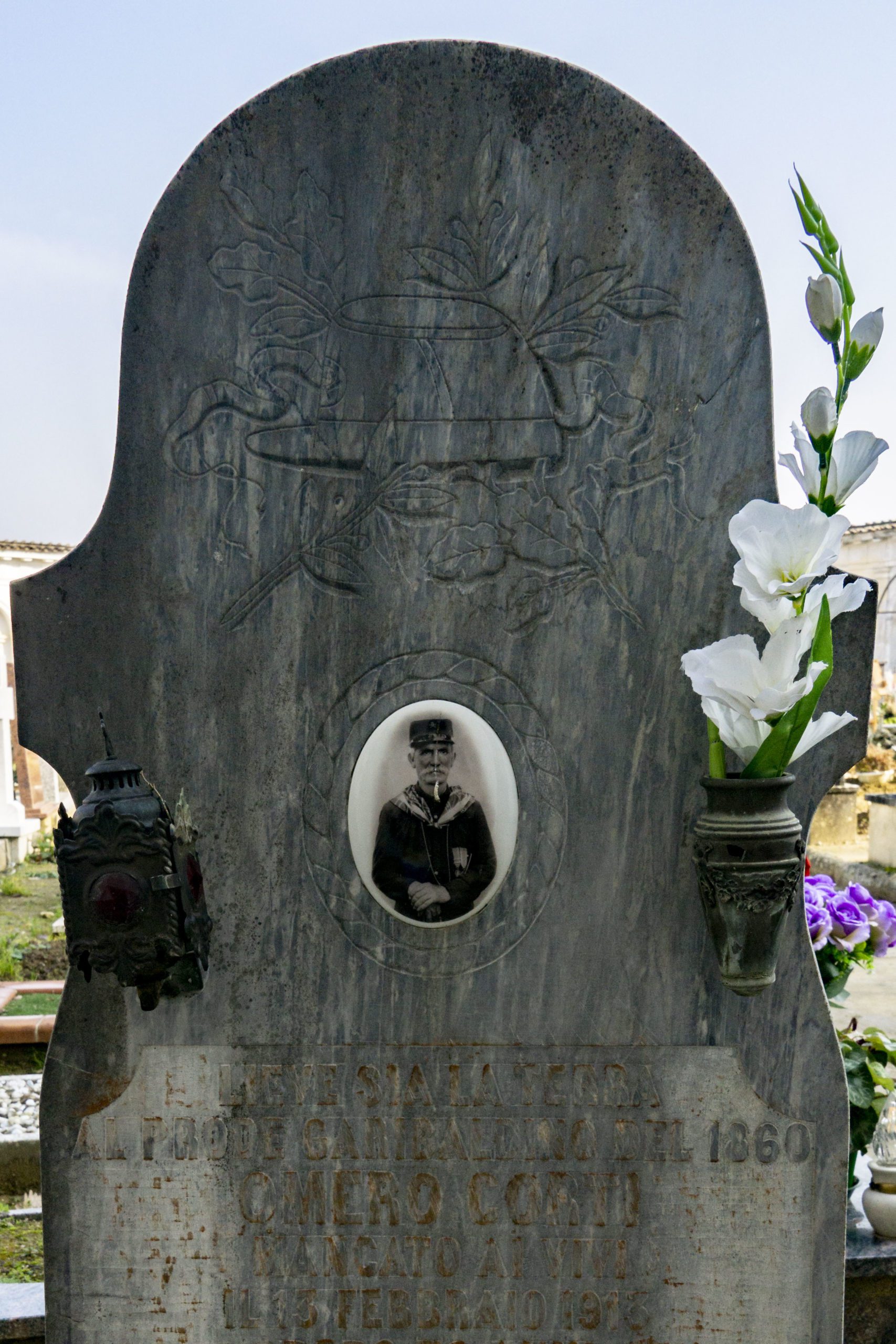 Omero Corti è stato una Giubba Rossa: un soldato di Giuseppe Garibaldi. Foiano aveva già incrociato il destino dell’Eroe dei due Mondi nel 1849 durante la sua marcia da Roma verso la Repubblica di Venezia, che stava resistendo alle potenze restauratrici e reazionarie. Il garibaldino foianese prese parte alla Spedizione dei Mille che da Quarto (Genova) avrebbe unificato l’Italia a partire dalla Sicilia. Si tratta di una tomba unica. Questo fa pensare che Corti fosse l’unico volontario del paese a essere partito con Garibaldi per unificare la Penisola. Nella foto al centro della lapide si può notare chiaramente la divisa e il berretto in dotazione ai volontari dell’esercito garibaldino. Sopra il ritratto è scolpito proprio lo stesso famoso cappello.