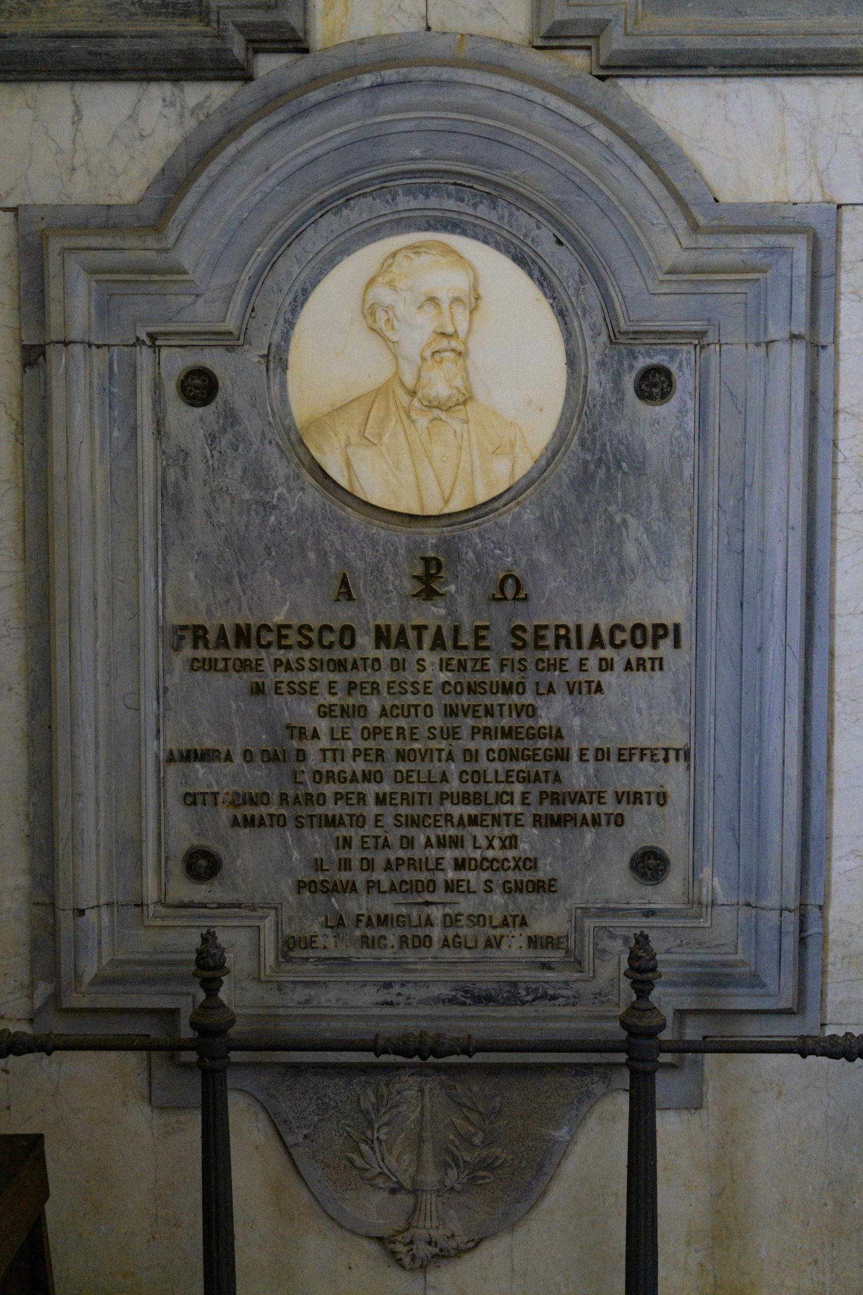 A Foiano il nome di Francesco Natale Seriacopi viene associato all’organo della Collegiata, la chiesa dei santi Martino e Leonardo edificata entro le mura cittadine. Costruito nel 1857 lo strumento fu dichiarato “dai maggiori componenti dell’epoca cosa meravigliosa più unica che rara“. Si spense nel 1891.