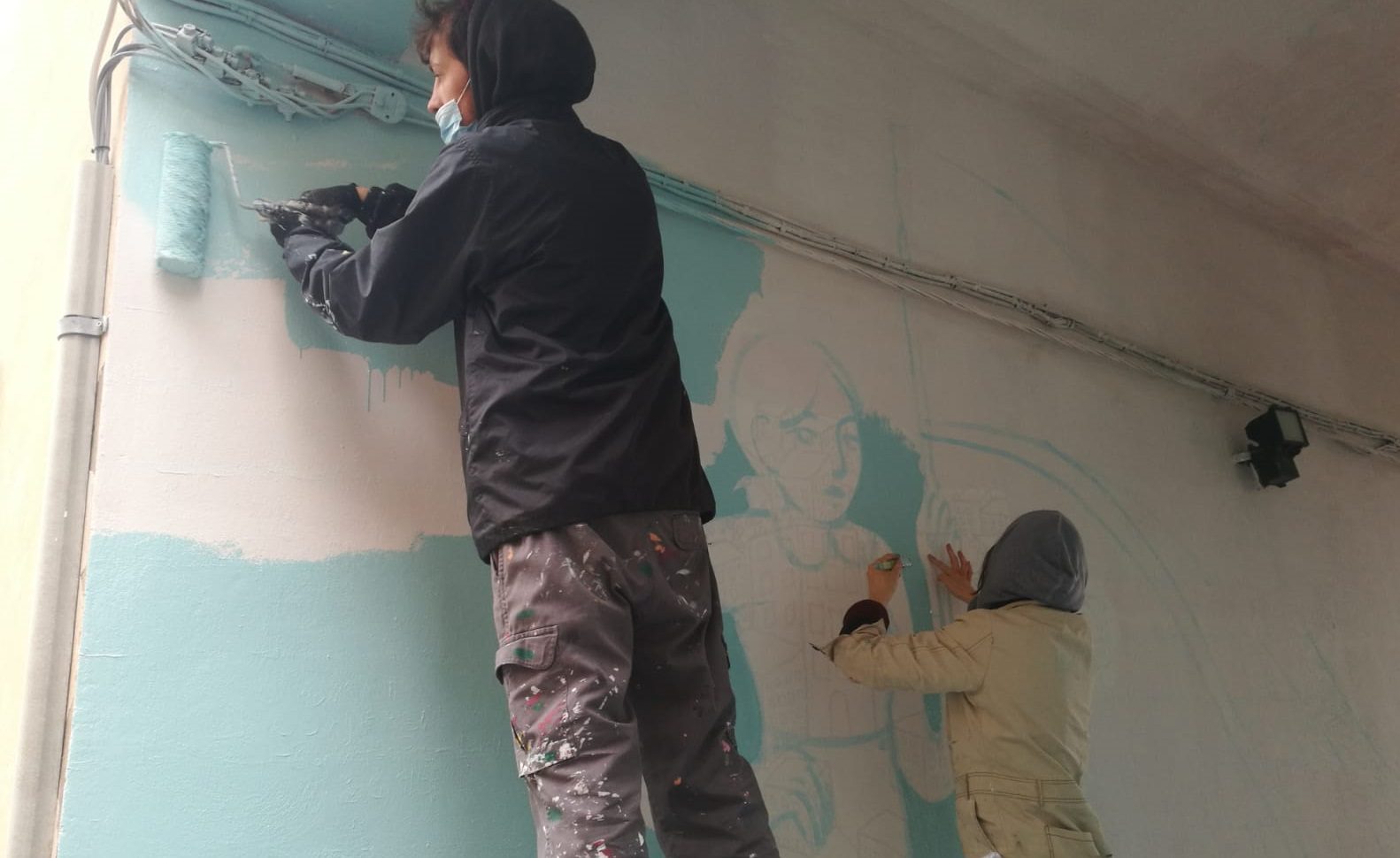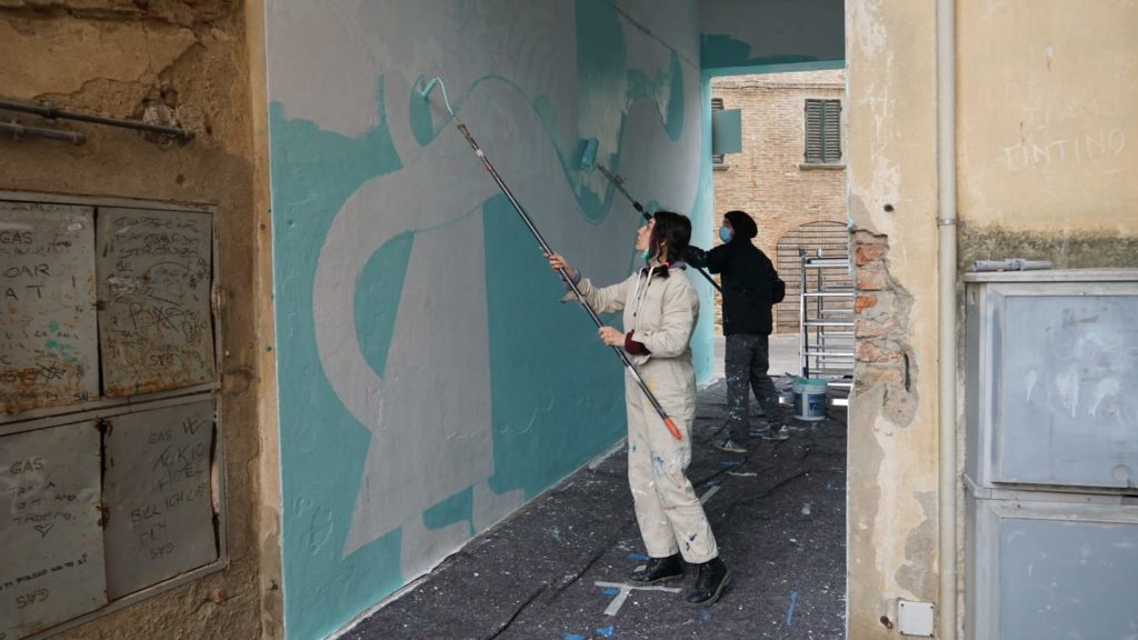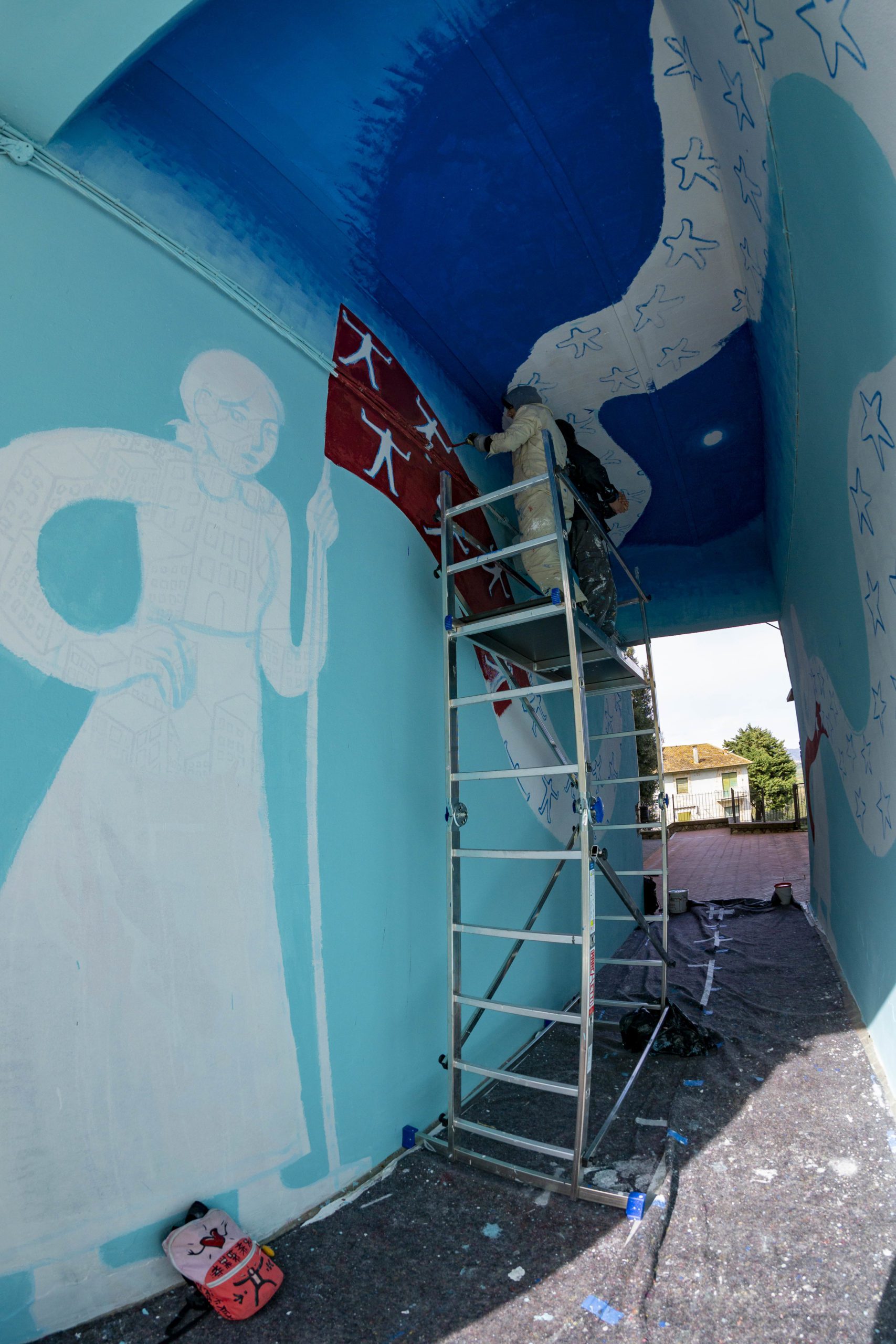 Sabato 3 aprile la street-artist fiorentina Nian e Matteo Bidini dell’associazione “A testa alta” hanno iniziato i lavori nella galleria di Piazza Licio Nencetti. Per le prossime due settimane Nian preparerà i muri con prodotti aggrappanti, per poi iniziare a tracciare le linee del disegno che serviranno da riferimento per la colorazione.