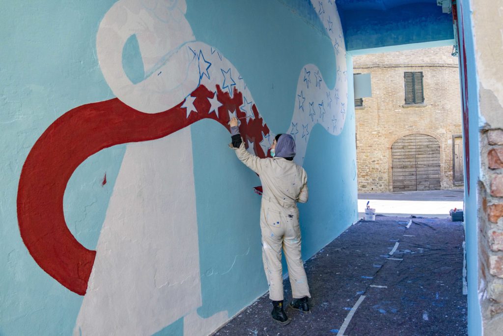 “Nella notte ci guidano le stelle” è il titolo che Nian ha dato alla sua opera. Ce la facciamo raccontare da lei, immersi nel murale che ci avvolge tutt’intorno.