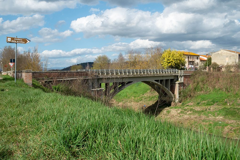 Quella dei Ponti d’Arezzo è una storia di costruzioni e restauri. Dove il Sentiero della Bonifica si interseca con la strada Senese Aretina le auto sfrecciano veloci. Sopra il Canale Maestro un traffico intenso fa vibrare di continuo la più recente di una lunga serie di infrastrutture che, proprio qui, hanno permesso per secoli di attraversare la vecchia palude.