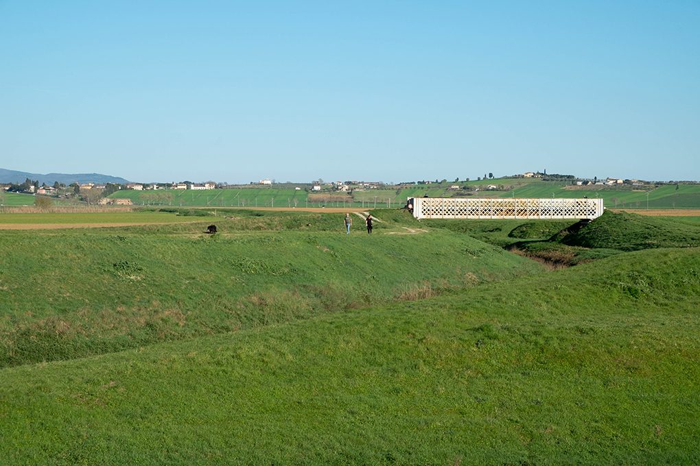 Si prosegue in direzione Nord sullo sterrato. Da un lato si vedono più leopoldine sparpagliate nella campagna, dall’altro la Chiana si abbassa e lì vicino i colombi ispezionano il terreno in cerca di cibo. Contro la calura del sole il vento diventa un ristoro prezioso in questo segmento che, privo di alberi, rende impossibili soste all’ombra. Si costeggia un laghetto sulla destra e, un po’ più in là, un traffico placido scorre sulla strada provinciale. Bisogna accorgersi del 32 che si legge sulla segnaletica del sentiero per sapere di avere alle spalle poco più della metà del percorso ciclopedonale. Botte allo Strozzo si trova a qualche centinaio di metri, le bocche delle due canne come un paio d’occhi socchiusi che scrutano la bici in arrivo.