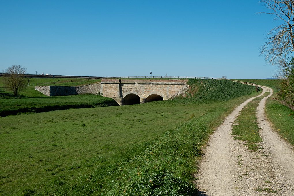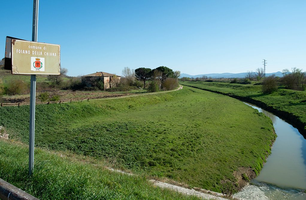 All’altezza del cartello per la Fattoria Le Chianacce un trattore rosso percorre il Sentiero della Bonifica e svolta in una zona di erba e terra battuta. L’itinerario scende e risale cento metri più avanti, ricalcando la Chiana come tracciato e larghezza. Si arriva ad un ponte di cemento moderno, sulla cui estremità sinistra è segnalato il confine tra le province di Siena e Arezzo.