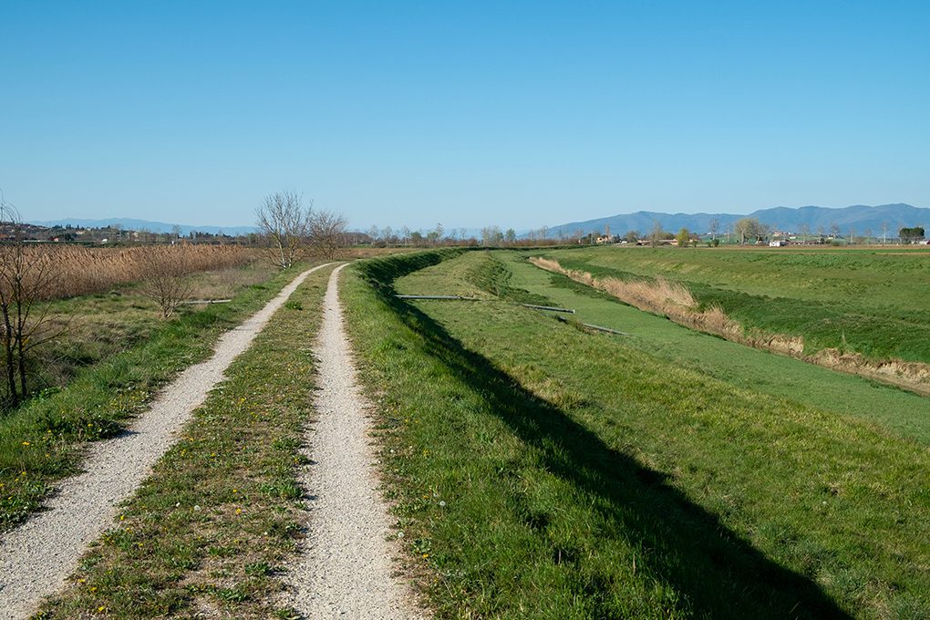 Il Sentiero della Bonifica si arrampica in cima all’antica infrastruttura di pietra e mattoni, poi una discesa piuttosto ripida dà velocità alla bicicletta. Si ricominciano ad usare i pedali prima del viadotto del raccordo autostradale, con a lato un muro di erba; si sale di nuovo leggermente e la segnaletica qui risulta un po’ confusa. Destra, ponte e subito a destra per un secondo passaggio sotto all’autostrada, superato il quale si mostra l’altra faccia di Botte allo Strozzo. Una fila di tubi provenienti da uno specchio d’acqua a forma di ellisse buca la terra sotto alle ruote e si allunga verso la Chiana. Lo sterrato forma una “T” con la strada asfaltata e riprende all’altezza di due sedie chiare che qualcuno ha disposto all’aperto. Dal prato lì davanti, ma più in basso, si solleva lo starnazzio di una cricca di oci e papere.