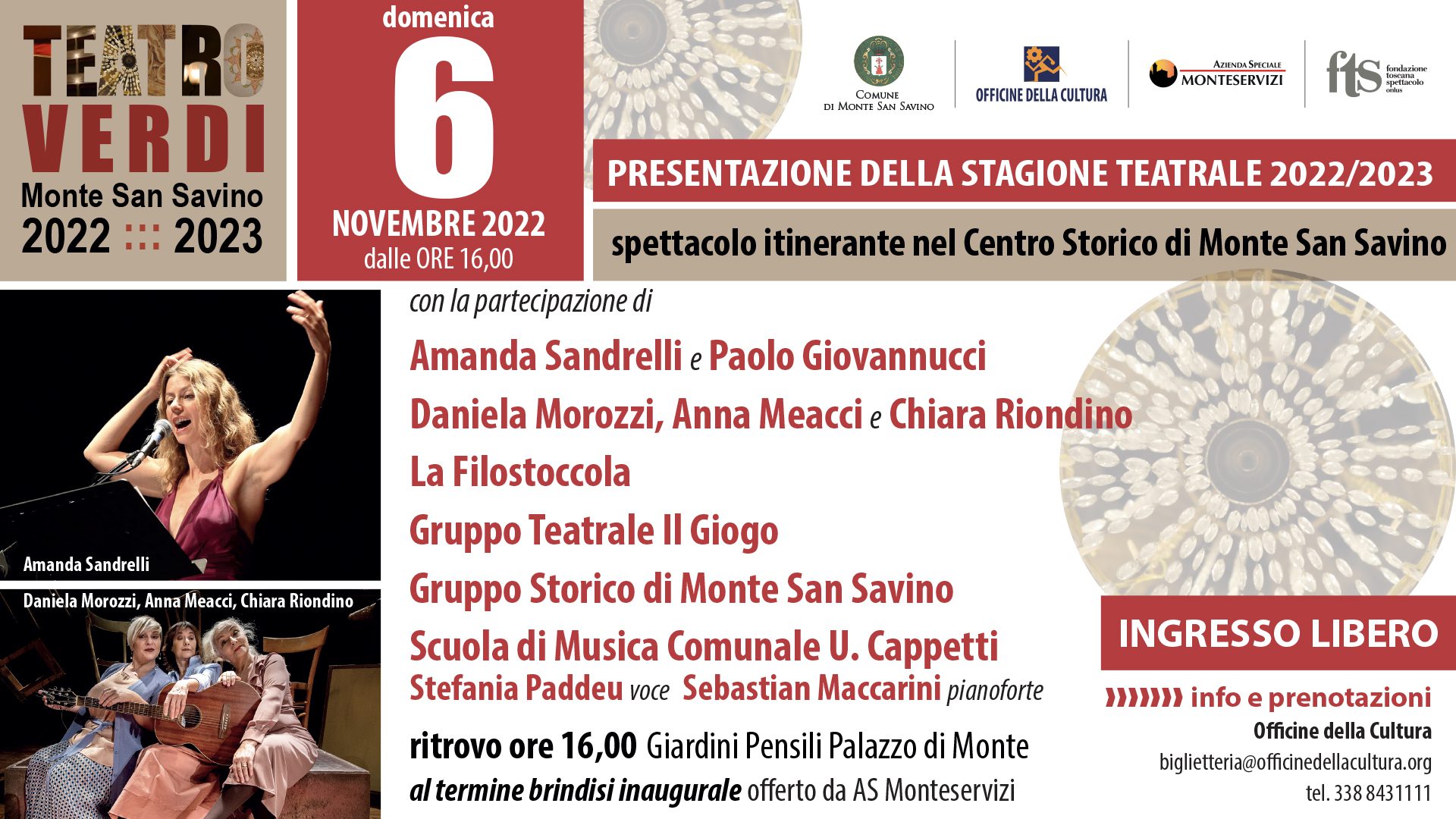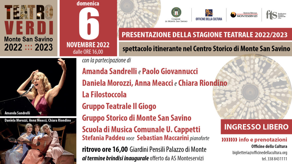 Evento gratuito a Monte San Savino in occasione della presentazione della Stagione Teatrale 2022/23 del Teatro Verdi con la partecipazione delle realtà culturali locali a fianco degli artisti in cartellone