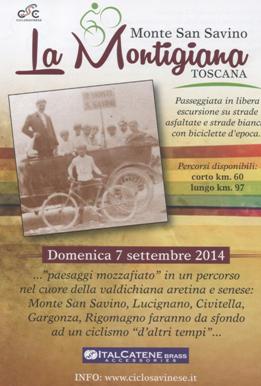 Paesaggi mozzafiato in un percorso nel cuore della Valdichiana aretina e senese: Monte San Savino, Lucignano, Civitella, Gargonza, Rigomagno faranno da sfondo ad un ciclismo d‘altri tempi. Questo è il leit motiv della passeggiata in libera escursione per appassionati di bici su strade asfaltate e strade bianche organizzata dall’Associazione La Montigiana Toscana con il patrocinio del comune di Monte San Savino, in programma domenica 7 settembre.