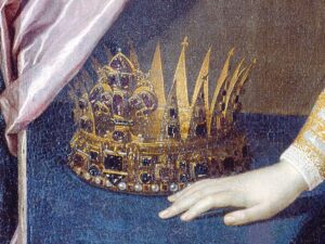 Per la realizzazione di questa corona si fece ricorso ad un’antica leggenda, che Cosimo I ritenne fondamentale per la storia toscana. Ricordate il frate Annio da Viterbo, il più grande falsario del tempo che attribuiva a Noè il ripopolamento della Toscana (L’origine di Foiano della Chiana) dopo il diluvio universale? A questo mito ci si ispirò per la fabbricazione, facendo riferimento alla corona dei re di Israele discendenti di David: la corona a raggi. Venne forgiato un capolavoro di oreficeria. Ovviamente diversa da quella principesca e da quella ducale, la corona era caratterizzata da un circolo d’oro ornato di smeraldi, rubini e perle, dal quale partivano punte triangolari d’oro verso l’alto. Priva del berretto di velluto interno, aveva la particolarità unica di avere, al centro nella parte anteriore, un grosso giglio, simbolo di Firenze.