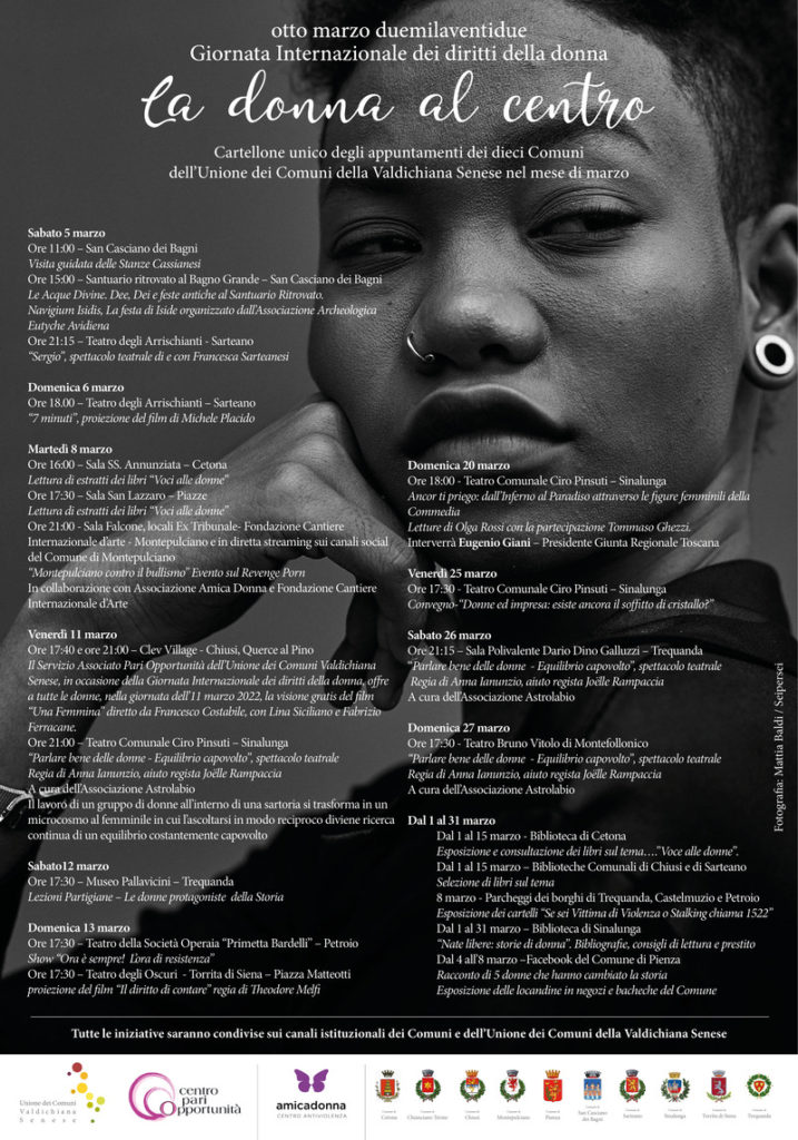 In occasione della Giornata Internazionale della Donna, evento annuale che ricorre l’8 marzo, l’Unione dei Comuni Valdichiana Senese propone la “La donna al Centro”, un cartellone unico di appuntamenti nei dieci Comuni che ne fanno parte, per ricordare le conquiste sociali e politiche che le donne hanno raggiunto nel corso degli anni. Il cartellone, che propone una serie di eventi, che inizieranno il prossimo 1° marzo e si protrarranno per tutto il mese fino al 31 marzo 2022, è un’occasione non solo per celebrare la giornata dedicata ai diritti delle donne, ma anche per far emergere, con le diverse iniziative, l’importanza dell’uguaglianza e del rispetto, occasione per celebrare donne che hanno cambiato la società, ma anche momenti riflessivi dove porre al centro l’educazione delle persone sui problemi e questioni ancora irrisolte di disparità sociale di genere.
