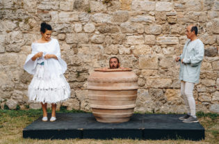 Gli Omini fanno ridere senza essere mai banali, lasciando decantare il riso del pubblico, patinando con un velatino d’amarezza gli squisiti quadri scenici proposti. Tra le tematiche spiccano le incomunicabilità generazionali, il confronto tra “vinti”, la solitudine; nuclei seri, affrontati in maniera decisamente originale, tra echi malapartiani e spunti comici, tra illogicità drammatica e teatro-verità. Una prova degli attori sopraffina: ognuno degli interpreti copre i ruoli di ben tre personaggi diversi, favorendo gli switch tra i caratteri attraverso cambi inequivocabili di posture, toni vocali e capacità emotive, in una moltiplicazione interpretativa lodevole che si configura in esilaranti vezzi, profili riconoscibili. La bravura dei tre protagonisti è esposta anche attraverso i perfetti e divertentissimi loop che invece di rallentare il racconto, forniscono respiro alla scena, tramenano la linearità dello svolgimento dello spettacolo, equilibrando il raziocinio con l’assurdo. I bravissimi Francesco Rotelli, Francesca Sarteanesi e Luca Zacchini, proliferano capacità espressive, dimostrano una perfetta coscienza di palco, un flusso univoco di battute, un ritmo perseverante e mordace nella sua risibilità. Il teatro degli Arrischianti non ha potuto che ridere continuativamente, e accompagnare la chiusura del sipario con un lungo e appagato applauso.