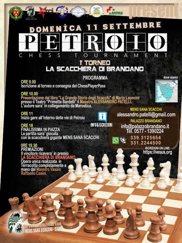 Un evento originale e molto particolare, che andrà a valorizzare le vie del borgo di Petroio e le sue produzioni tipiche attraverso un torneo che ambisce a diventare un punto di riferimento locale per tutti gli appassionati di scacchi e per tutti coloro che iniziano ad avvicinarsi a questa disciplina.