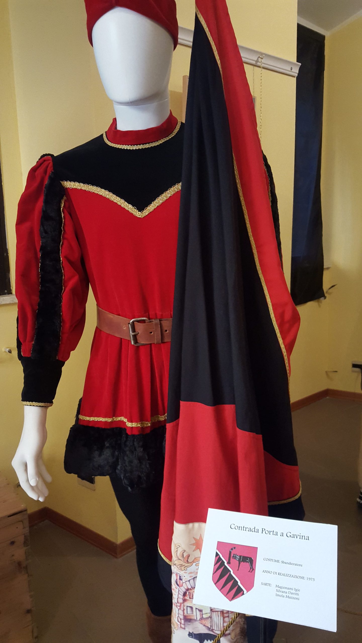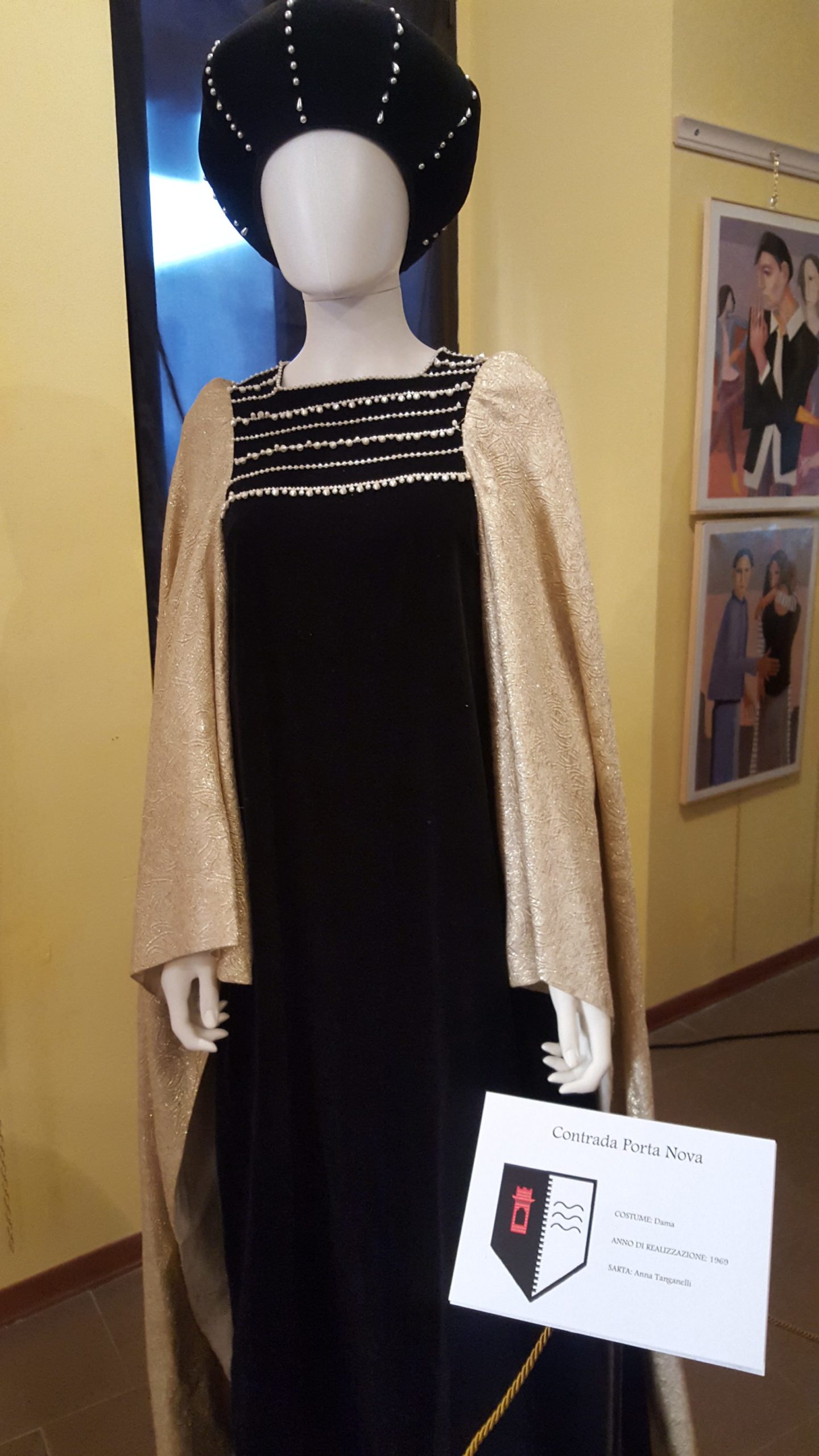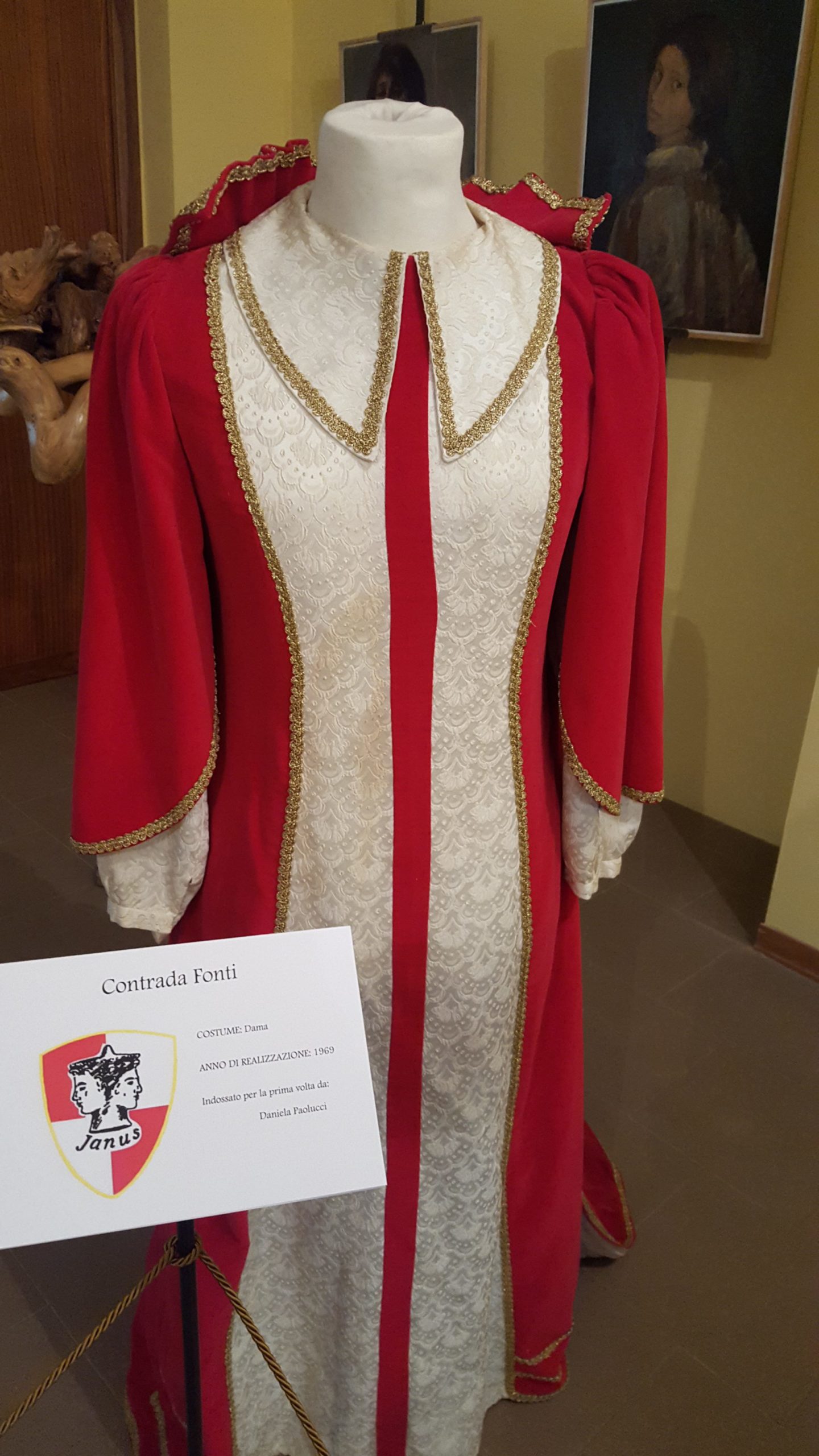 Gli abiti storici del corteo sono in mostra nei locali della Biblioteca Comunale insieme alla consueta mostra retrospettiva che quest’anno diventa multimediale guardando indietro ai 50 anni di storia del Palio.