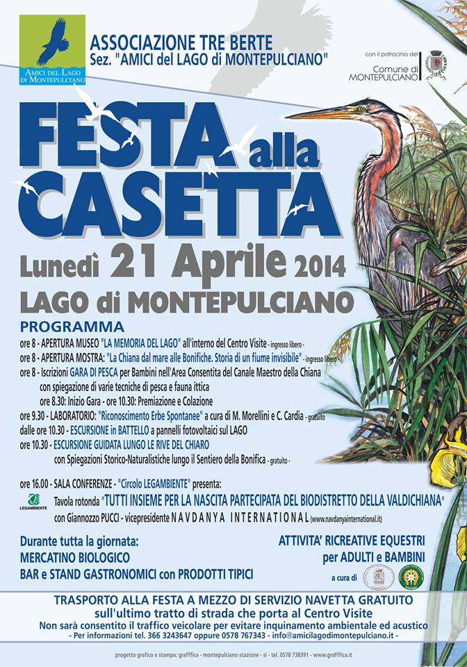 Una giornata ricca di eventi e importanti appuntamenti a partire dalle 8:00 con l’apertura del museo “La Memoria del lago” all’interno del Centro Visite, e l’apertura della mostra “La Chiana dal mare alle Bonifiche. Storia di un fiume invisibile”. Sempre alle 8:00 si apriranno le iscrizioni alla gara di pesca per bambini nell’area consentita del Canale Maestro della Chiana, con spiegazione di varie tecniche di pesca e della fauna ittica. Alle 9:30 laboratorio di “Riconoscimento di erbe spontanee” a cura di M.Morellini e C.Cardia, alle 10:30 escursione guidata lungo le rive del Chiaro con spiegazioni Storico-Naturalistiche lungo il Sentiero della Bonifica.