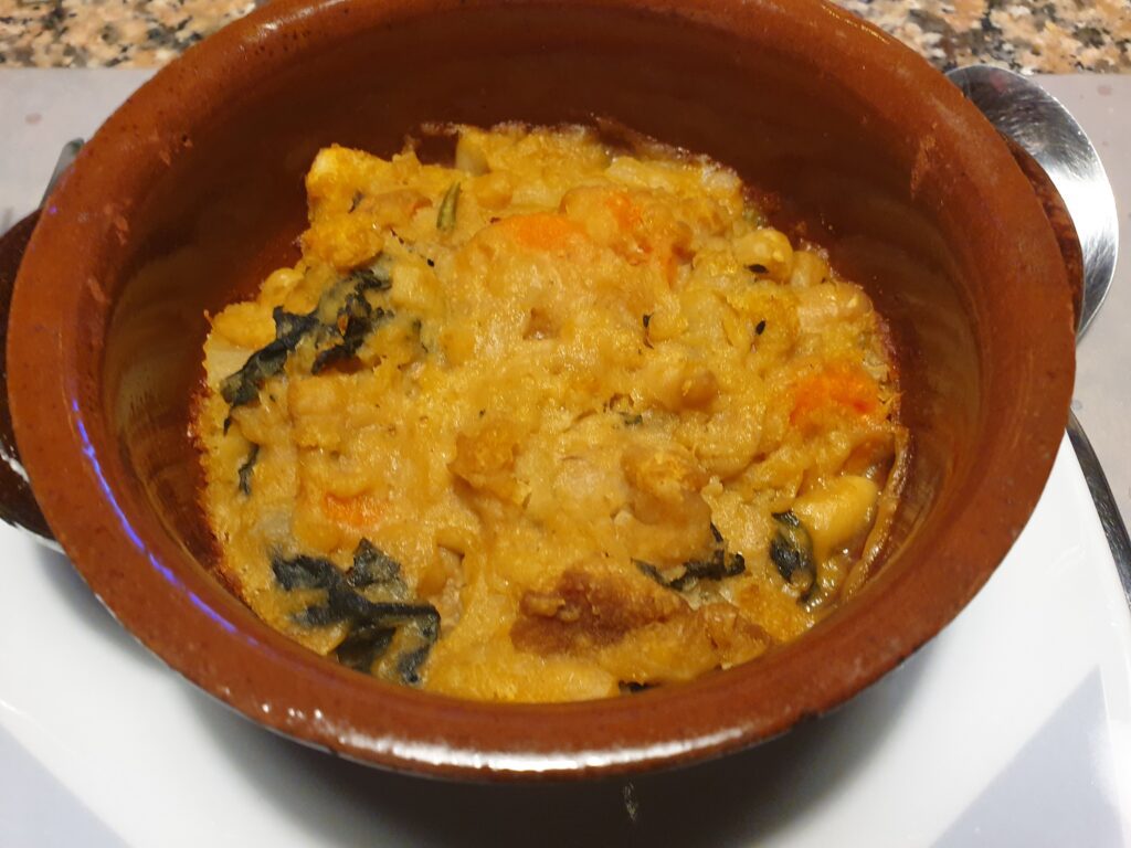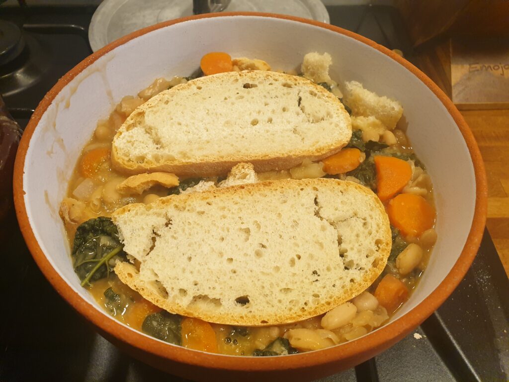 Unire i fagioli con il loro brodo e fare sobbollire a fuoco basso per circa 30 minuti fino a ottenere un minestrone grossolano che andremo a versare in una zuppiera, alternando strati di pane. Facciamo riposare per circa un’ora e serviamo in scodella aggiungendo un po’di minestrone, che avremo conservato a parte, ma soprattutto con Olio evo nuovo.