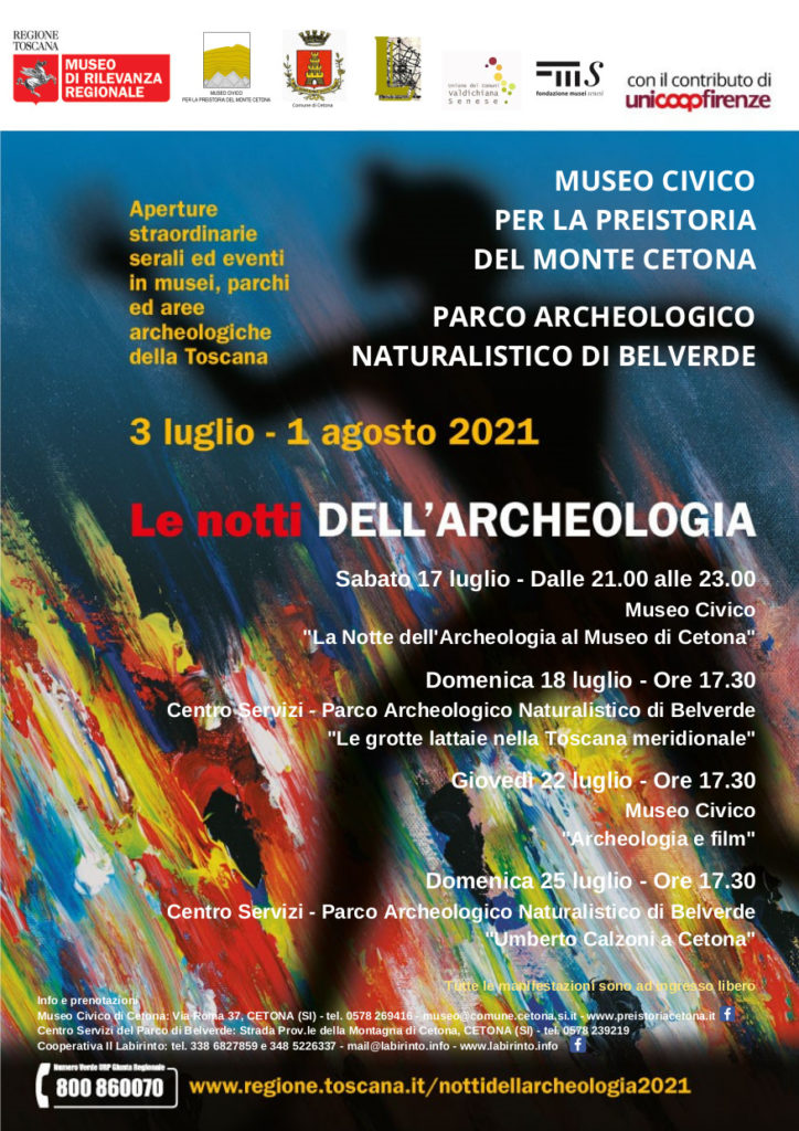 A Cetona sono quattro gli appuntamenti organizzati nell’ambito delle “Notti dell’Archeologia”. Tutto comincia sabato 17 luglio con l’apertura straordinaria notturna del Museo Civico per la preistoria del Monte Cetona (ingresso gratuito). Domenica 18 luglio, alle ore 17:30, presso il Centro Servizi del “Parco Archeologico Naturalistico di Belverde” si terrà la conferenza dal titolo “Le grotte lattaie nella Toscana meridionale”. Sarà lo speleologo Franco Rossi (Associazione Speleologica Senese) a raccontare la sua esperienza di esplorazione all’interno di cavità di queste straordinarie grotte a Cetona, frequentate dall’uomo sin da tempi remoti a scopo salutare o di culto. Il terzo appuntamento è fissato per giovedì 22 luglio alle ore 17:30 presso il Museo Civico per la preistoria del Monte Cetona con “Archeologia e film”; il pubblico potrà incontrare Massimo Vidale, archeologo dell’Università di Padova, e Dario Di Blasi, curatore di rassegne di cinema archeologico. L’ultimo appuntamento è previsto per domenica 25 luglio, sempre alle ore 17:30, presso il Centro Servizi del Parco di Belverde, con l’iniziativa dal titolo “Umberto Calzoni a Cetona” con Chiara De Marco, dell’Università di Siena che presenterà un video sulle ricerche che l’archeologo Umberto Calzoni (1881-1959), che fu direttore del Museo Archeologico di Perugia che tuttora conserva nella sezione preistorica i reperti dei suoi scavi effettuati nelle grotte Belverde di Cetona.