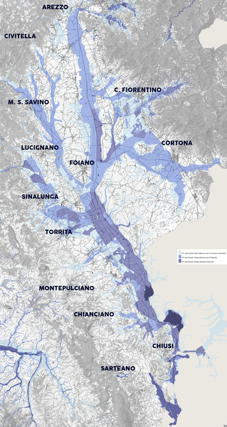 La Valdichiana, una pianura alluvionale, potrebbe essere definita un paesaggio d’acqua; per sua natura è un territorio delicato dal punto di vista idrogeologico, specialmente nella zona della piana. Eppure, lo sviluppo dei suoi centri abitati e delle infrastrutture che la attraversano non è stato progettato in modo da tenere conto di questa fragilità.