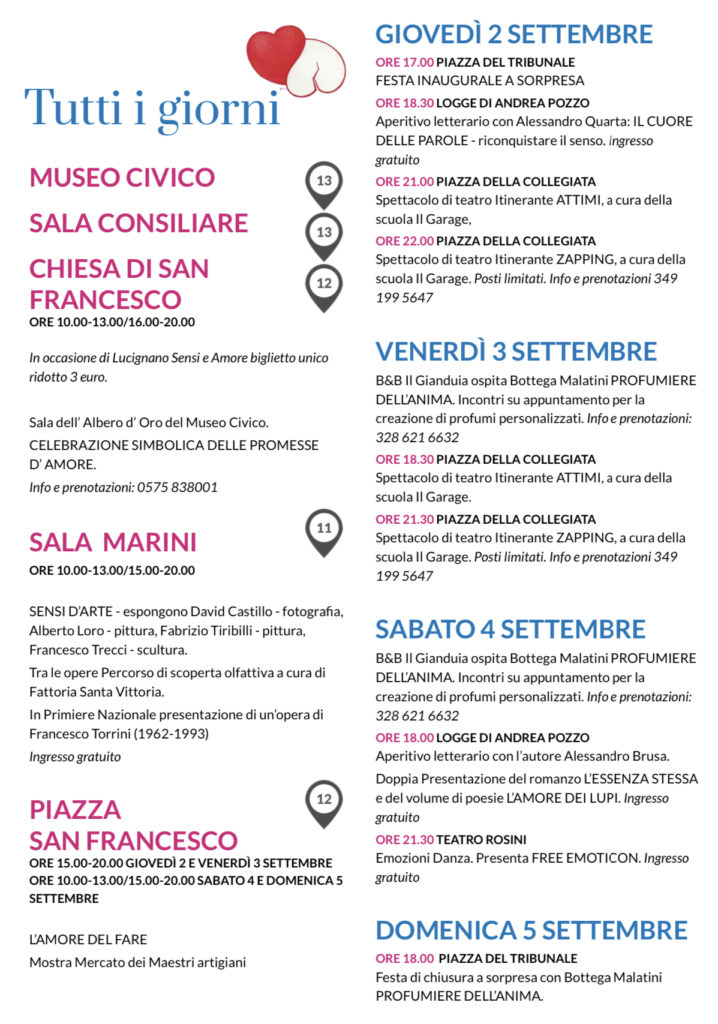 Lucignano Sensi e Amore è nata da una riflessione su Lucignano, conosciuto non solo per essere uno dei borghi più belli d’Italia ma anche tra i più romantici. Da secoli gli innamorati si scambiano promesse d’amore davanti all’Albero d’Oro che è conservato nel museo Civico. In “Lucignano, Sensi e Amore” sono I cinque sensi il fil rouge di tutta la manifestazione. Gli artisti presenti sono legati a Sensi e Amore da più tratti comuni. Sicuramente c’è la passione verso il proprio fare, indipendentemente dai campi in cui si agisce. C’è l’impegno, perché qualsiasi arte ha bisogno di dedizione, studio costante, motivazione. C’è l’aver accolto gli spunti di riflessione e di lavoro che sono stati proposti , l’entusiasmo con cui tutti hanno aderito all’invito a partecipare Fin da subito questa manifestazione è stata concepita come punto di convergenza per le Eccellenze culturali, eccellenze che si presentano anche con progetti artistici creati appositamente per Lucignano Sensi e Amore.