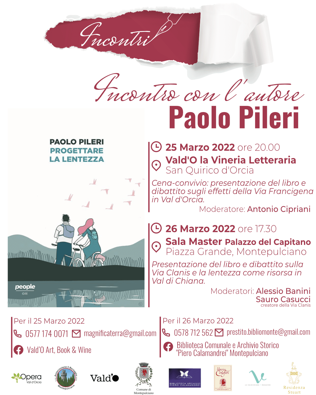 Continua il ciclo di “Incontri” culturali a Montepulciano con un appuntamento per sabato 26 marzo 2022 alle ore 17:30: la presentazione del libro “Progettare la lentezza” di Paolo Pileri nel Palazzo del Capitano a Montepulciano.