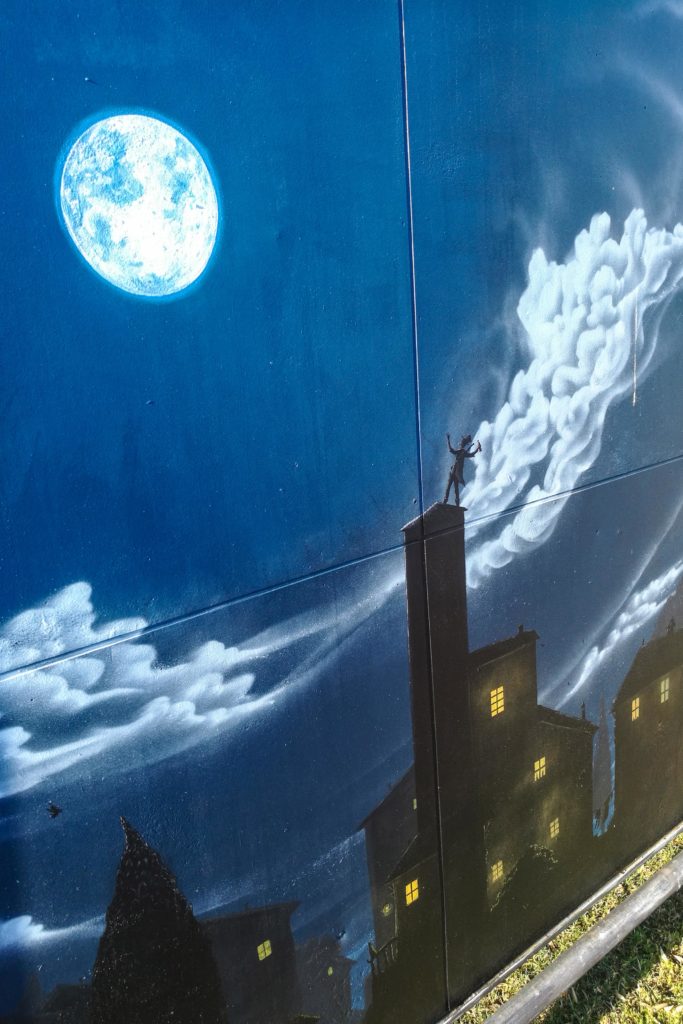 Poi ci siamo spostati a Tegoleto dove ho trovato super affascinante la leggenda di Gnicche. Abbiamo letto libri su di lui, abbiamo parlato con la gente del posto, ci siamo fatti un studio approfondito su questo personaggio ed è venuta fuori questa illustrazione dove ho immaginato come potesse essere il profilo del paese a metà dell’800. In cima a una torre ho messo il brigante Gnicche, ubriaco con una bottiglia in mano. La notte ha permesso di legare ancora di più l’ambientazione con il personaggio, con l’inconscio e la follia, con ciò che non si vede e il mistero della vita del bandito. Durante la pittura è arrivato un signore che riconosceva le finestre di camera sua sugli edifici che io avevo creato dalla mia fantasia. È stato molto bello. Le persone che si fermavano a guardare riconoscevano dentro i disegni qualcosa che li legava al loro territorio.