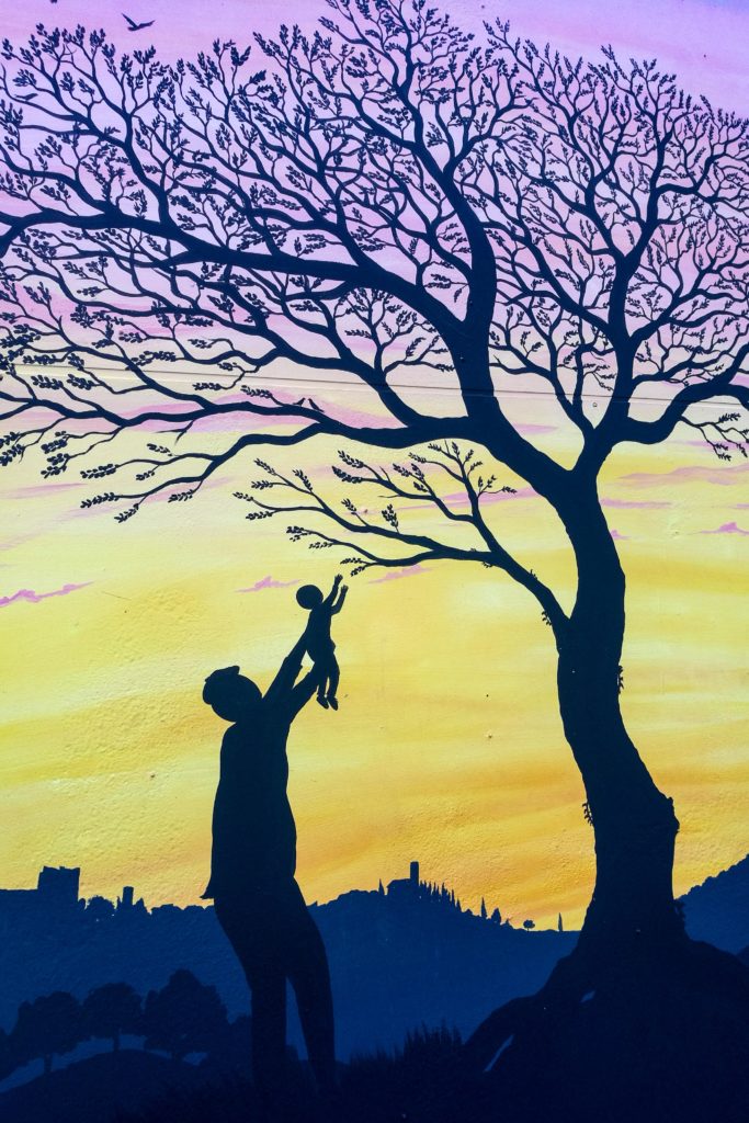 Se la sera è la fine del giorno che si lega alla guerra e alla morte e la notte rappresenta ciò che è celato, a Civitella abbiamo voluto ambientare la scena all’alba: simbolo di rinascita. Il disegno è riferito alla strage a opera dei nazifascisti che trucidarono 244 civili innocenti. E poi c’è l’albero con i germogli in fioritura e sotto un nonno che solleva in alto un bambino per farlo arrivare alle gemme. Anche questo significa rinascita”.