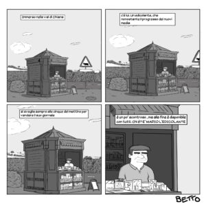 “L’edicola di Mario” è una serie di strip umorostiche basate sul personaggio ideato e creato dal nostro vignettista di fiducia Michele Bettollini (Betto), apparse negli scorsi mesi sulle pagine del magazine online “La Valdichiana”. Nelle tavole che troverete in questa raccolta imparerete a conoscere il carattere burbero di Mario, chianino DOC, alle prese con tanti argomenti che caratterizzano il nostro territorio. Dai prodotti tipici (l’aglione, la chianina, i pici) agli eventi locali (il Bravìo, il Carnevale) alle tradizioni (il befano, la vendemmia, e così via). Troverete anche delle storie inedite, preparate appositamente per questa raccolta.