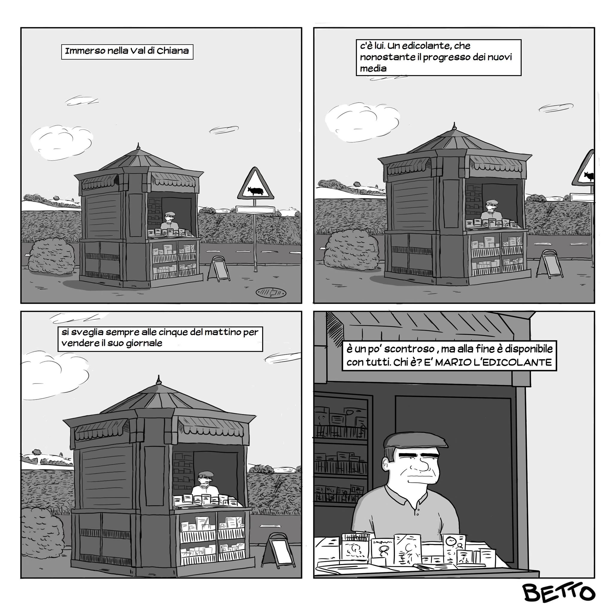 Mario è un edicolante dal carattere difficile: sempre scontroso e scostante, ma con un grande amore per il territorio in cui vive. Gestisce un’edicola, un piccolo chiosco che negli anni passati caratterizzava anche a livello visivo le strade cittadine, ma che con la crisi dell’editoria e la rivoluzione digitale ha subito grandi trasformazioni.